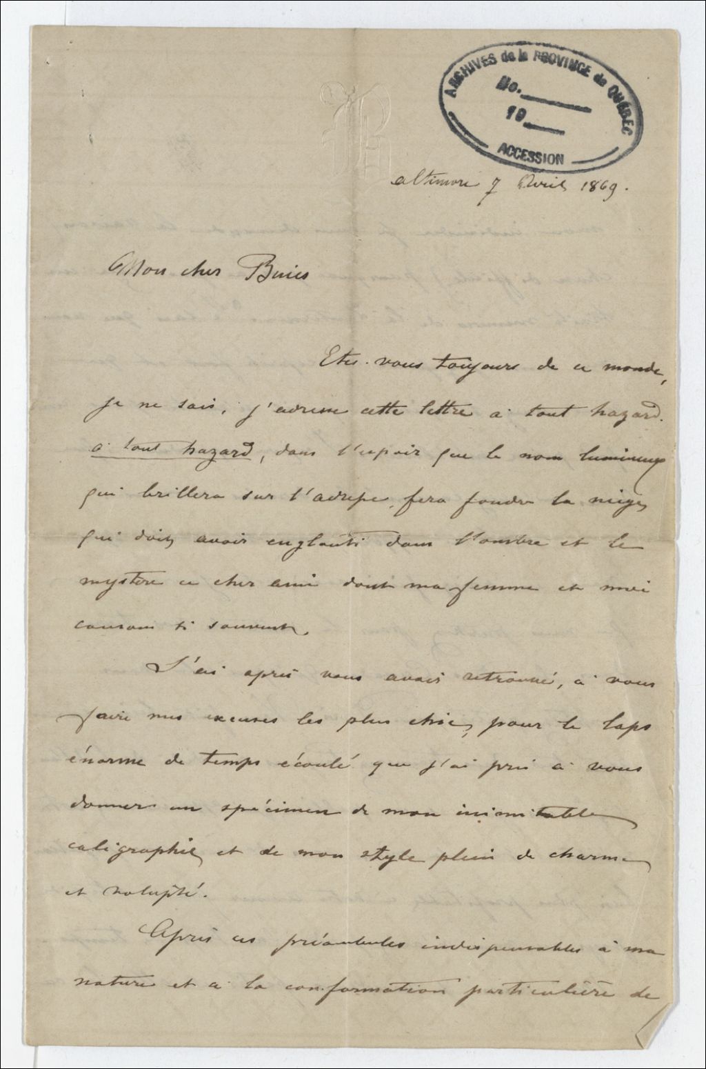 Lettre du violoniste et compositeur Frantz Jehin-Prume et de sa femme, le soprano Rosita del Vecchio, à Arthur Buies