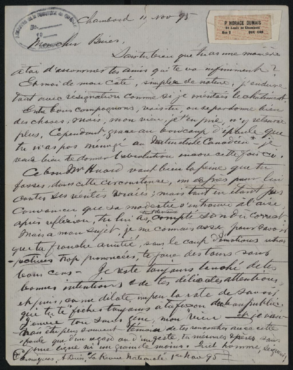 - Lettre d'Horace Dumais à Arthur Buies