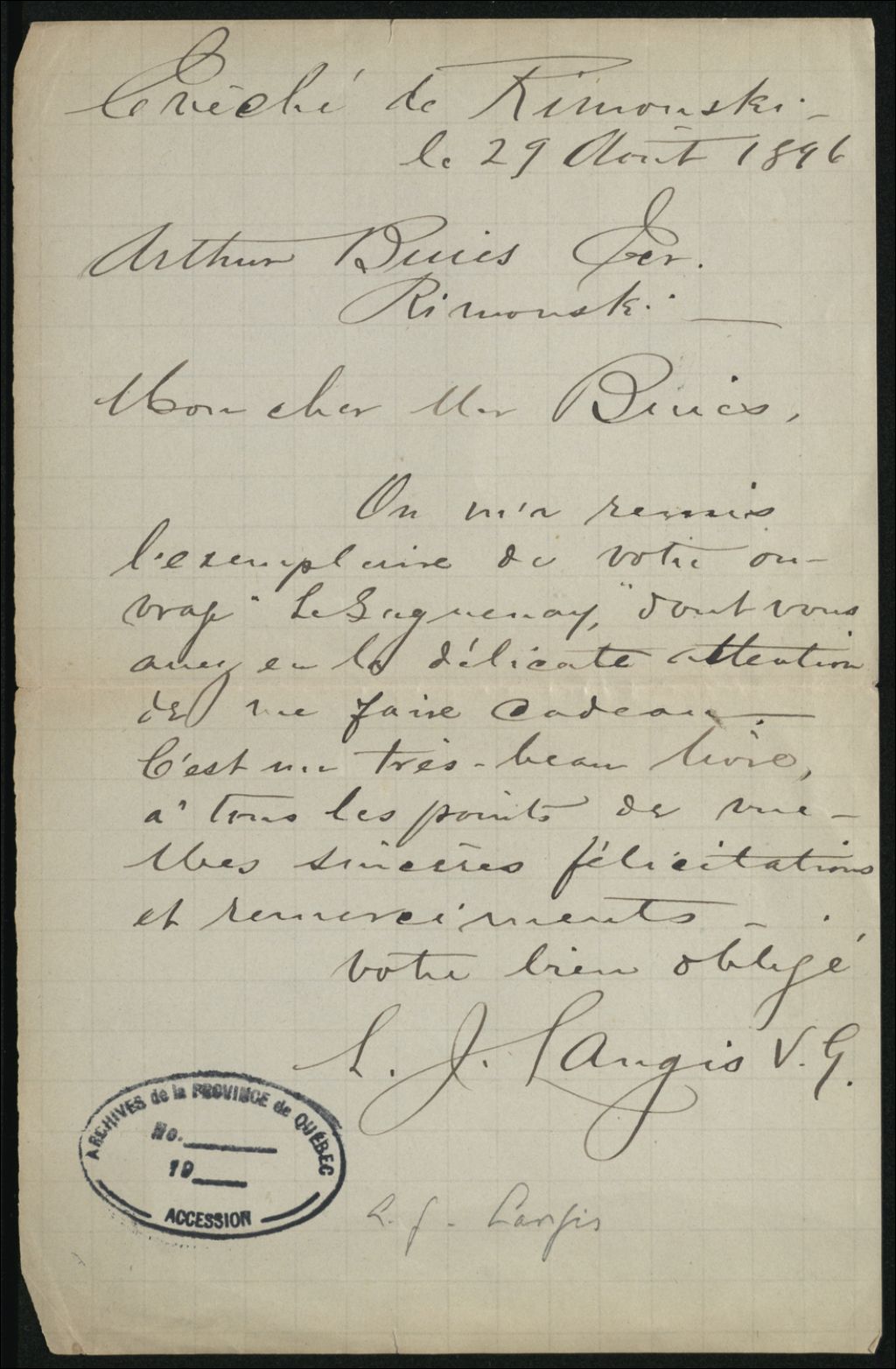 - Cette lettre en provenance de l¿Évêché de Rimouski remercie et félicite Arthur Buies pour son livre offert sur le Saguenay