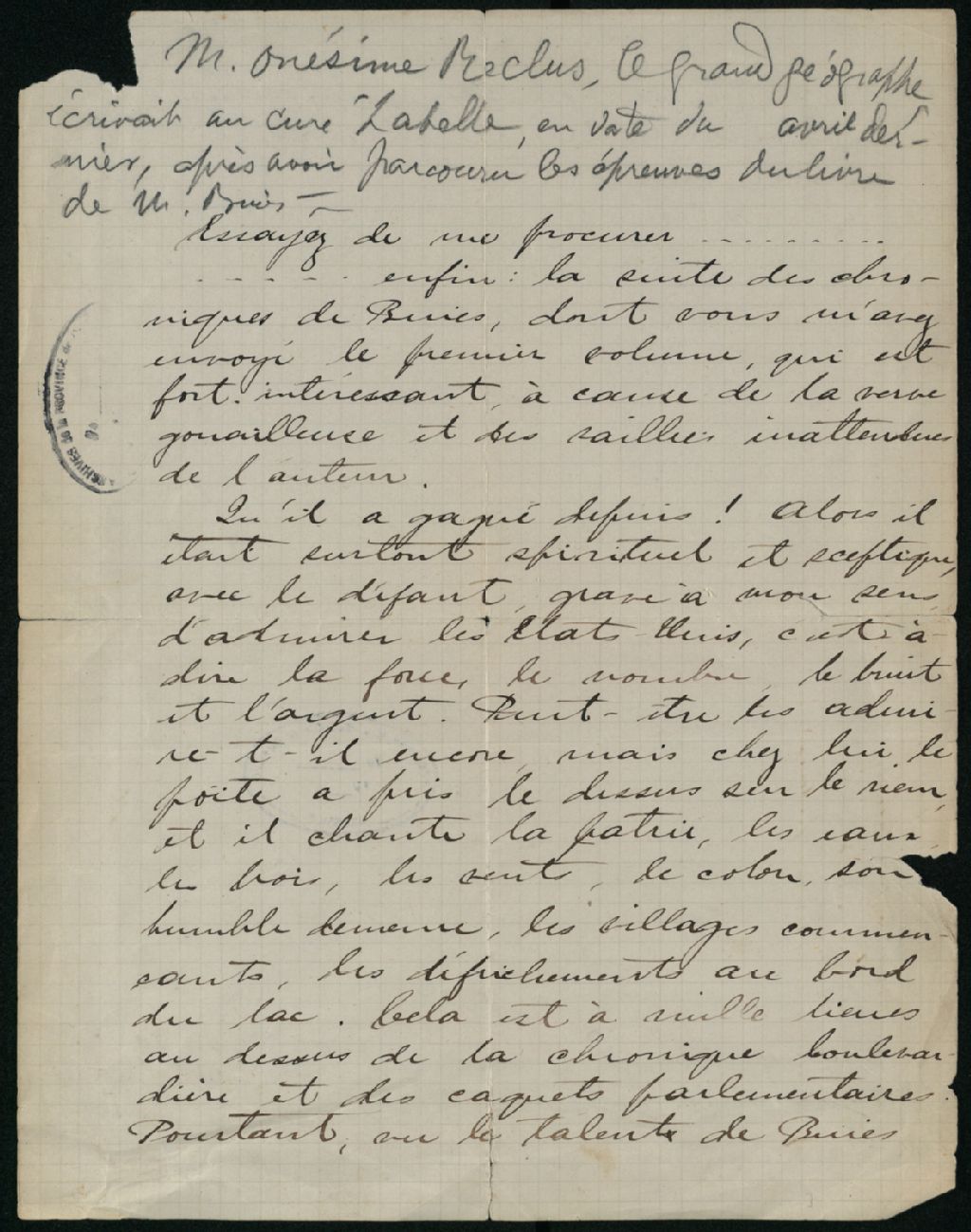 - Extrait d'une lettre d'Onésime Reclus au curé Antoine Labelle à propos d'Arthur Buies