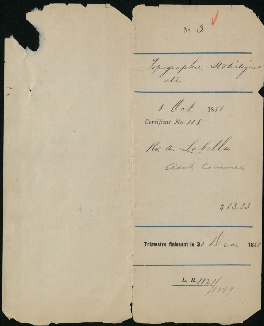 - Salaire d’Arthur Buies pour le mois d’octobre 1888 au Département de l’Agriculture et de la Colonisation de la province de Québec