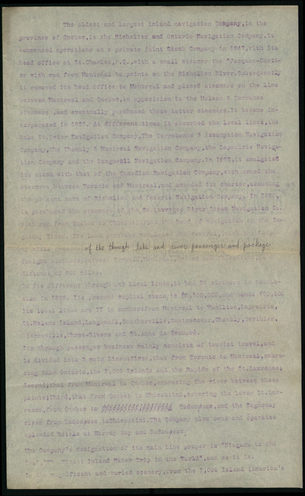Texte sur l’histoire de la Compagnie de navigation du Richelieu et d’Ontario