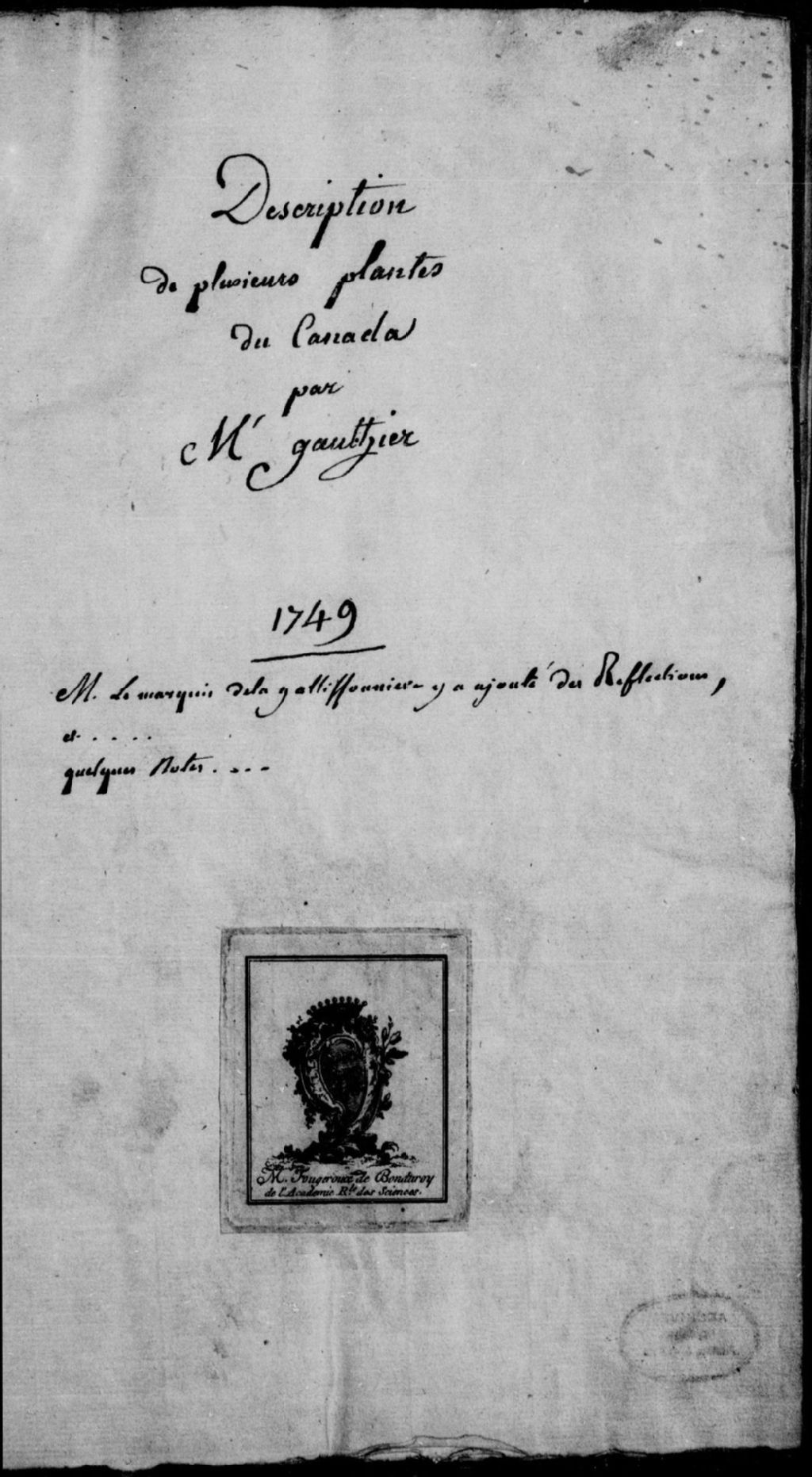 Informations permettant une mise en contexte du Description de plusieurs plantes du Canada par Mr Gauthier (Gaultier) 1749