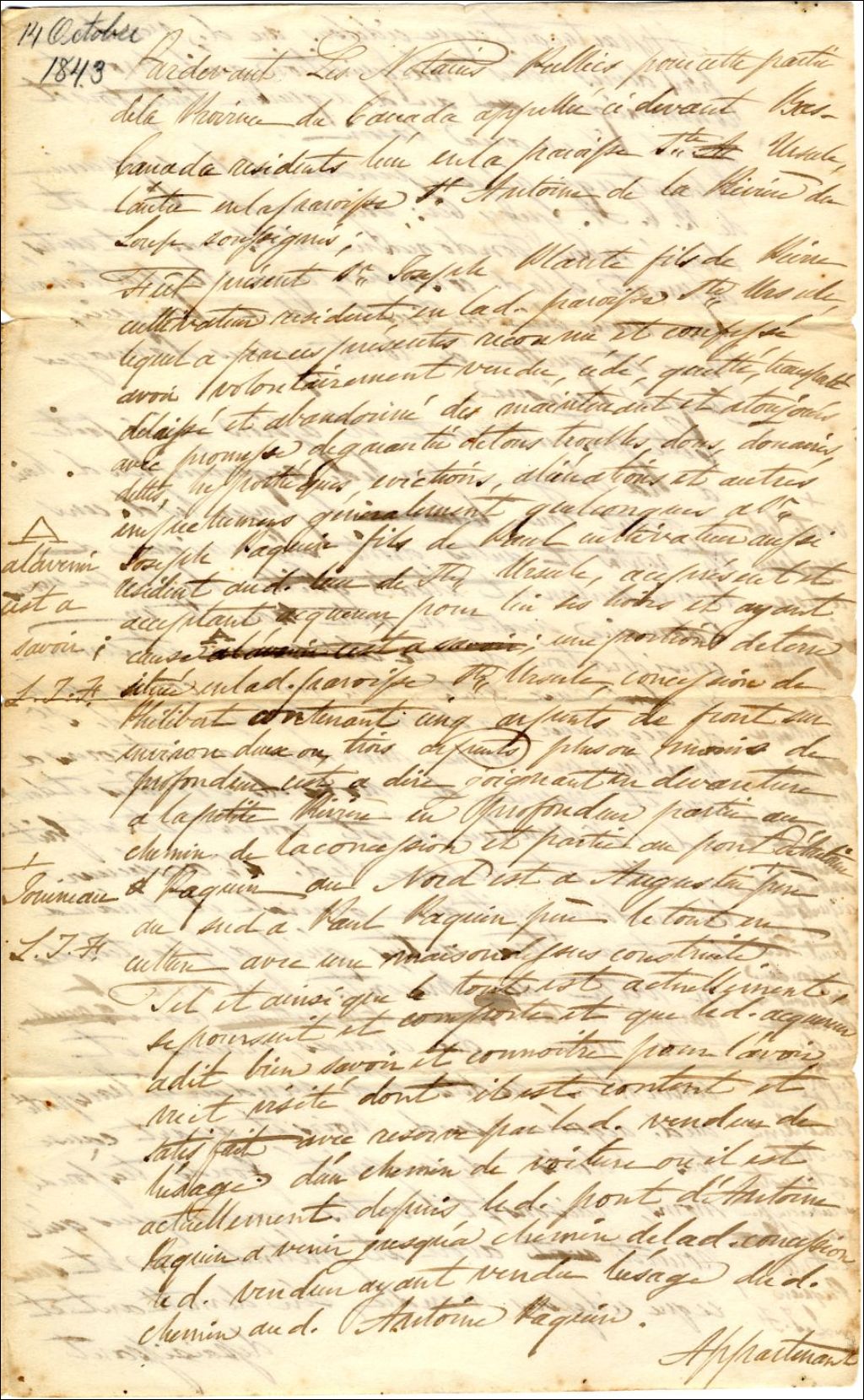 - Ce dossier contient des actes de ventes et d'échanges de particuliers concernant la paroisse Saint-Antoine entre le 14 octobre 1843 et le 13 mars 1855