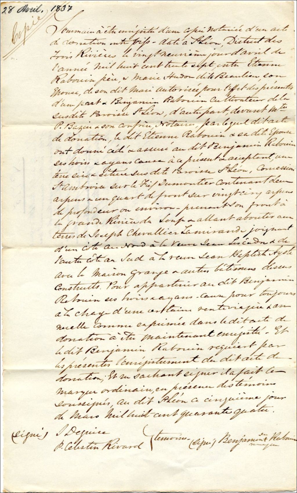 - Ce dossier contient des extraits de ventes de terres dans le Fief Dumontier. Ils ont été rédigés entre le 28 avril 1837 et le 15 décembre 1853 sous le sieur Bartholomew Conrad Augustus Gugy