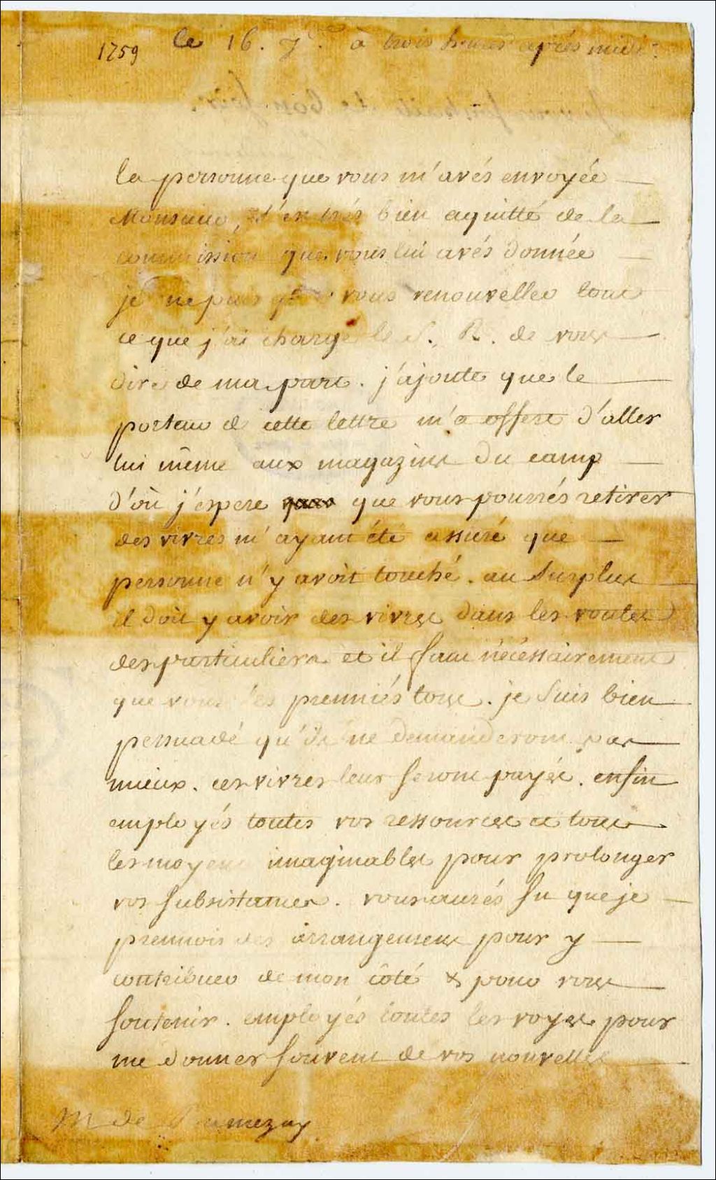 Lettre du marquis de Vaudreuil à Ramezay sur la possibilité de retirer des vivres dans les voûtes des particuliers en totalité pour satisfaire aux besoins de subsistance, 16 septembre 1759, Archives nationales à Québec, Fonds Jean Baptiste Nicolas Roch de Ramezay, (03Q,P224,P10).