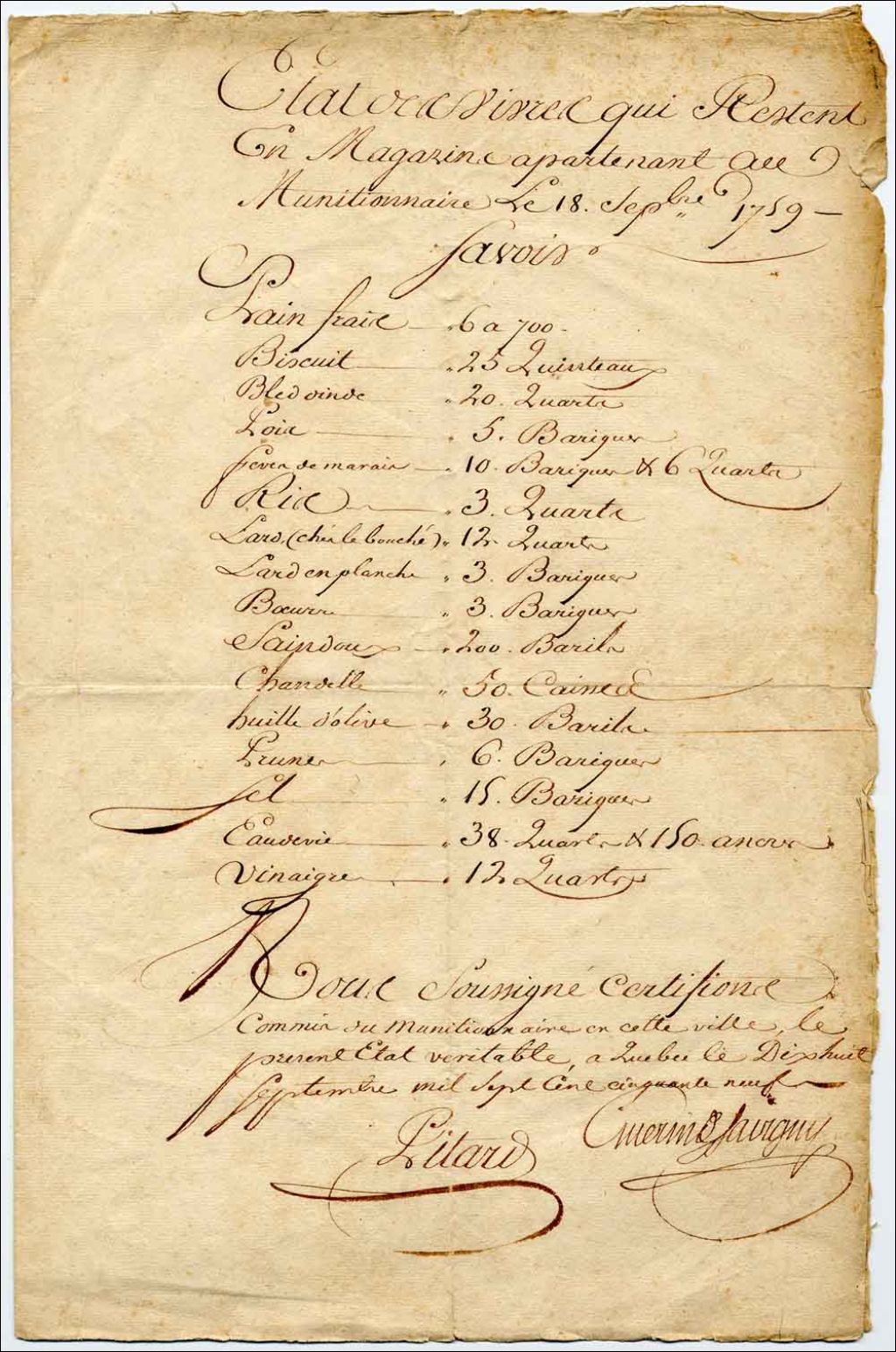État des vivres qui restent dans les magasins à Québec, 15 et 18 septembre 1759, Archives nationales à Québec, Fonds Jean Baptiste Nicolas Roch de Ramezay, (03Q,P224,P13).