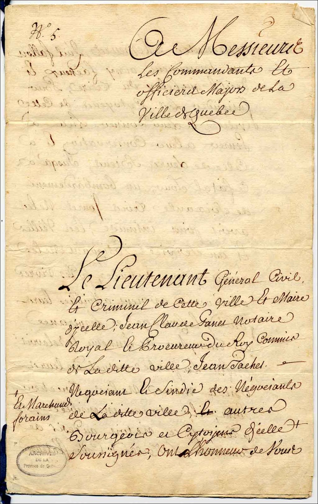 - Lettre adressée aux commandants et aux officiers majors de la ville de Québec, fournissant les raisons du passage du pouvoir aux ennemis anglais et mentionnant qu'il ne faut pas avoir honte de céder quand on est dans l'impossibilité de vaincre