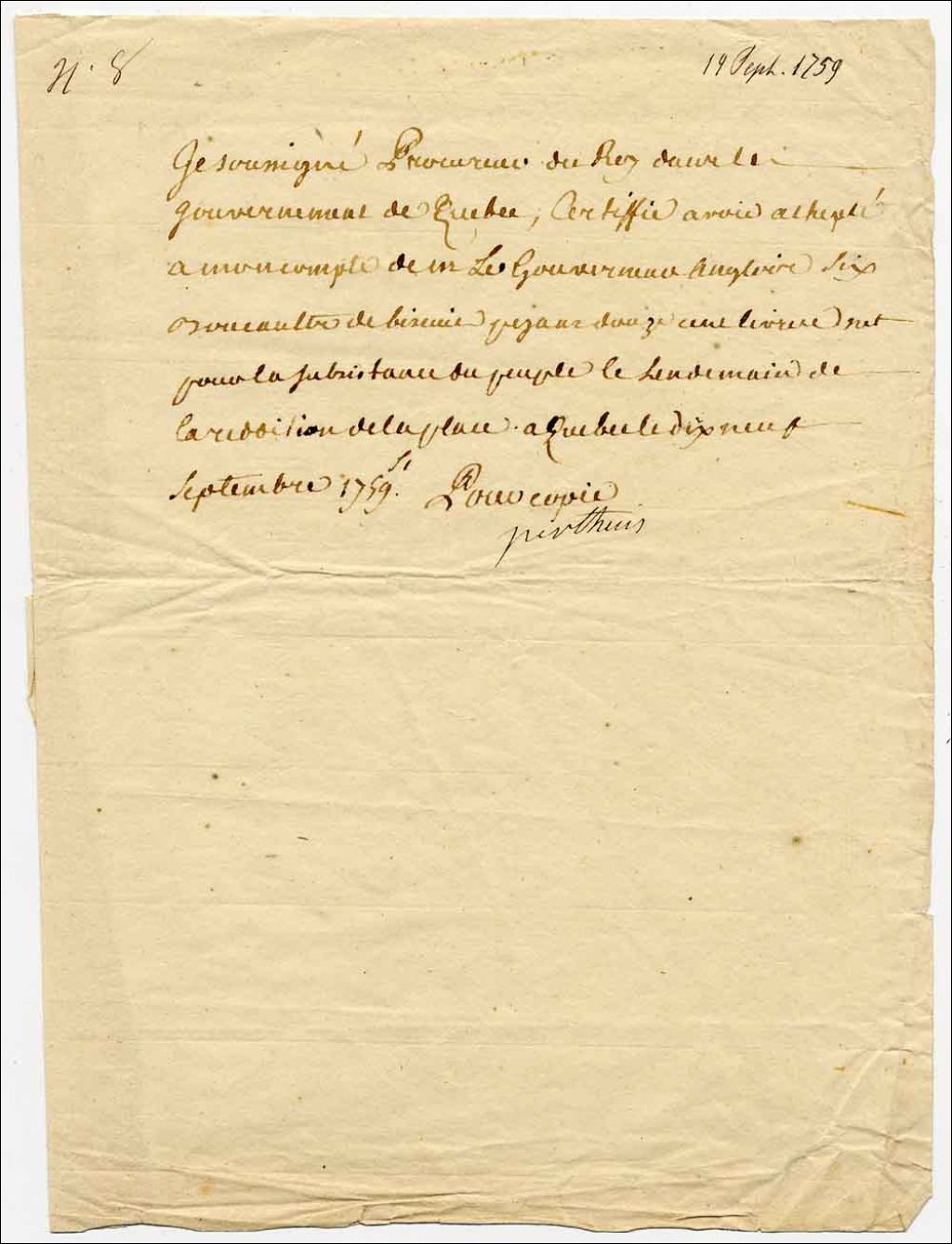 Lettre de Perthuis certifiant l'achat de biscuits pour la subsistance du peuple le lendemain de la reddition de Québec, 19 septembre 1759, Archives nationales à Québec, Fonds Jean Baptiste Nicolas Roch de Ramezay, (03Q,P224,P20).