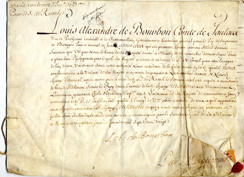 - Le premier brevet par le Roi, reconnaît au sieur de Rossel les qualités et l'expérience nécessaire pour acquitter les fonctions d'enseigne sur les vaisseaux de guerre, signé Louis; le second brevet, accordé par Louis Alexandre de Bourbon, Comte de Toulouse, Duc de Penthièvre, Damville et de Châteauvillain, gouverneur et lieutenant général pour le Roi de sa Province de Bretagne, pair et amiral de France, reconnaît et ordonne aux vice-amiraux, lieutenants généraux, chefs d'escadron et capitaines de vaisseaux de le reconnaître aussi en sa qualité d'enseigne de vaisseau