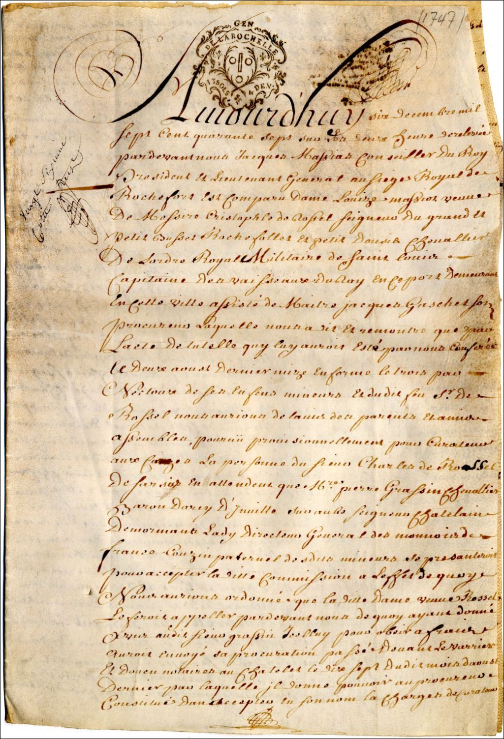- Acte passé pardevant Jacques Massias, conseiller du Roi, Président et Lieutenant général au Siège Royal de Rochefort. Sont également mentionnés: Dame Louise Massiot, veuve du feu sieur Christophe de Rossel, seigneur du grand et petit Bussel Rochefollet (Rochefolles) et petit Dousia, chevalier de l'Ordre militaire de Saint-Louis, capitaine des vaisseaux du Roi à Rochefort, assistée de maître Jacques Gaschet, son procureur; Levarrier, notaire au Châtelet; le sieur Joseph de la Motte (Lamotte - Lamothe), écuyer; le sieur Jacques Vidart de Saint-Clerc, chevalier de l'Ordre militaire de Saint-Louis, chef de l'Ordre réformée de la Marine; le sieur Jean Belliveau (Beliveau), chevalier de l'Ordre Royal et Militaire de Saint-Louis, capitaine des vaisseaux du Roi à Rochefort; le sieur Jean Barail, commandant de l'Ordre Royal et Militaire de Saint-Louis, chef d'escadre des armées navales de Sa Majesté