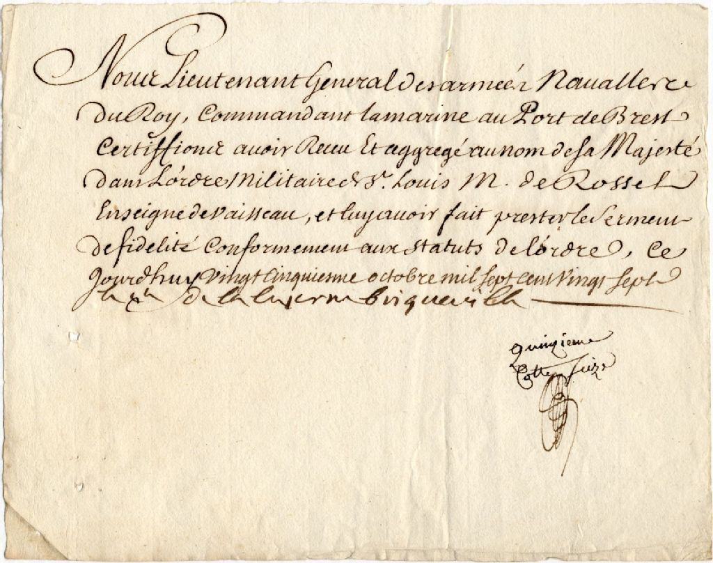 Nous lieutenant général des armées navales du Roi commandant la Marine au Port de Brest, certifions avoir reçu et agrégé au nom de Sa Majesté dans l'Ordre Militaire de Saint-Louis le sieur de Rossel, enseigne de vaisseau, et lui avoir fait prêter le serment de fidélité conformément aux statuts de l'Ordre, signé Briqueville