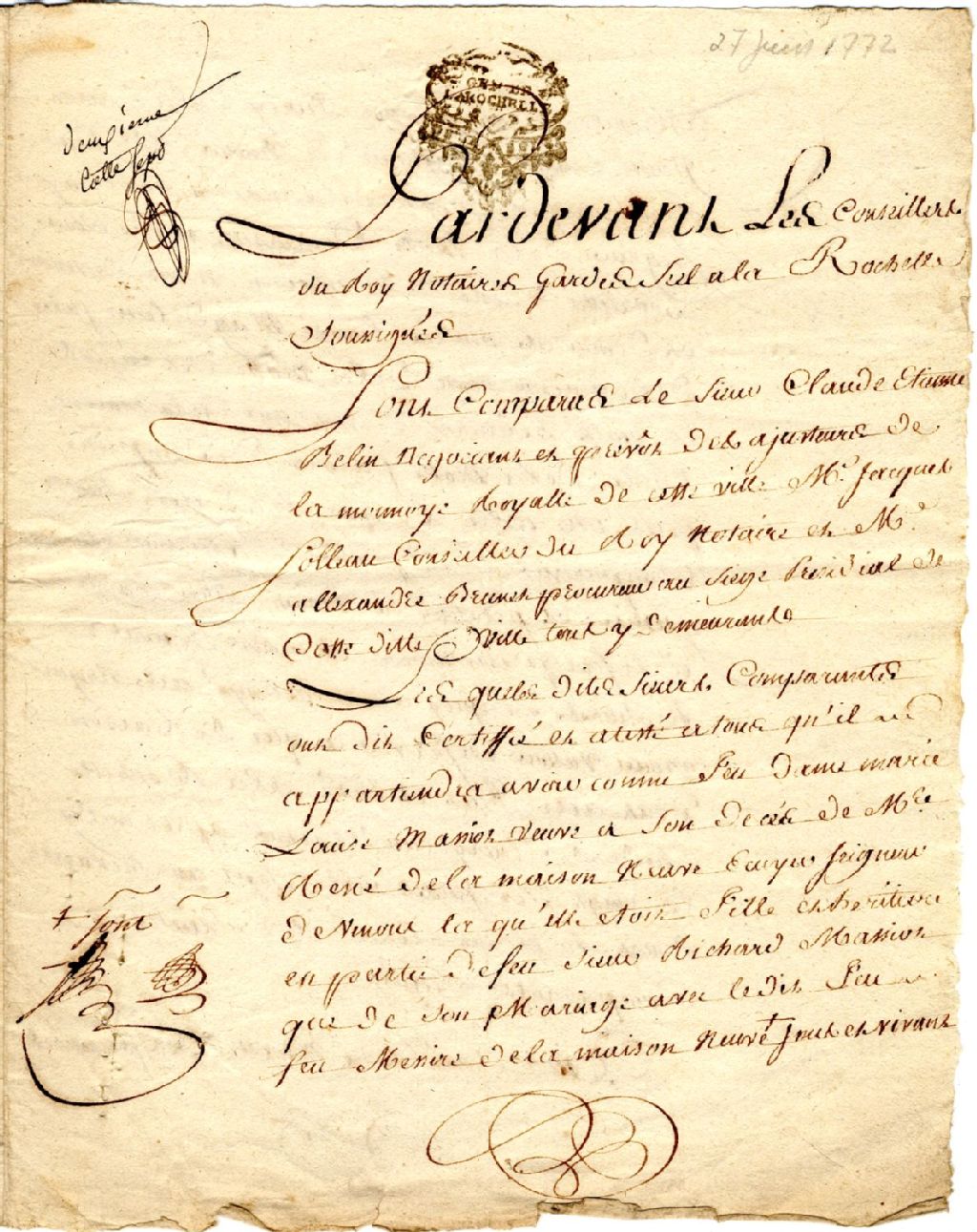 Comparution, certification et attestation pardevant le notaire Fleury de La Rochelle, à propos de la feue Dame Marie Louise Massiot, veuve à son décès du feu maître René de la maison neuve (Maisonneuve), écuyer, 27 juin 1772, Archives nationales à Québec, Fonds Famille Louis-Auguste de Rossel, (03Q,P234,D4,P15).