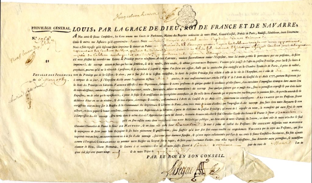 Acte accordant un privilège général au sieur de Rossel, ancien capitaine des vaisseaux du Roi, pour la réalisation de 18 estampes gravées d'après des tableaux originaux appartenant au Roi représentant les combats en mer pendant la dernière guerre, 11 mars 1789, Archives nationales à Québec, Fonds Famille Louis-Auguste de Rossel, (03Q,P234,D4,P17).