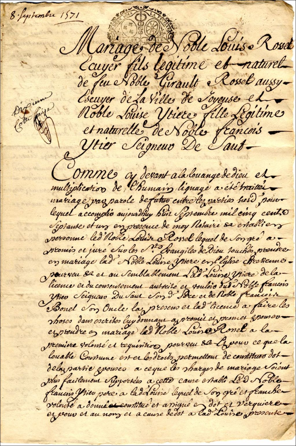 - Copie du contrat de mariage de Noble Louis Rossel, écuyer, fils légitime et naturel du feu Noble Giraud Rossel, aussi écuyer de la ville de Joyeuse, et Noble Louise Ytière (Ytier), fille légitime et naturelle du Noble François Ytier, Seigneur de Saut