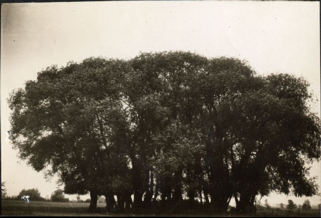 Photographie noir et blanc, Touffe d'arbre où est le monument Boucherville, P.Q., un petit boisé dans une plaine