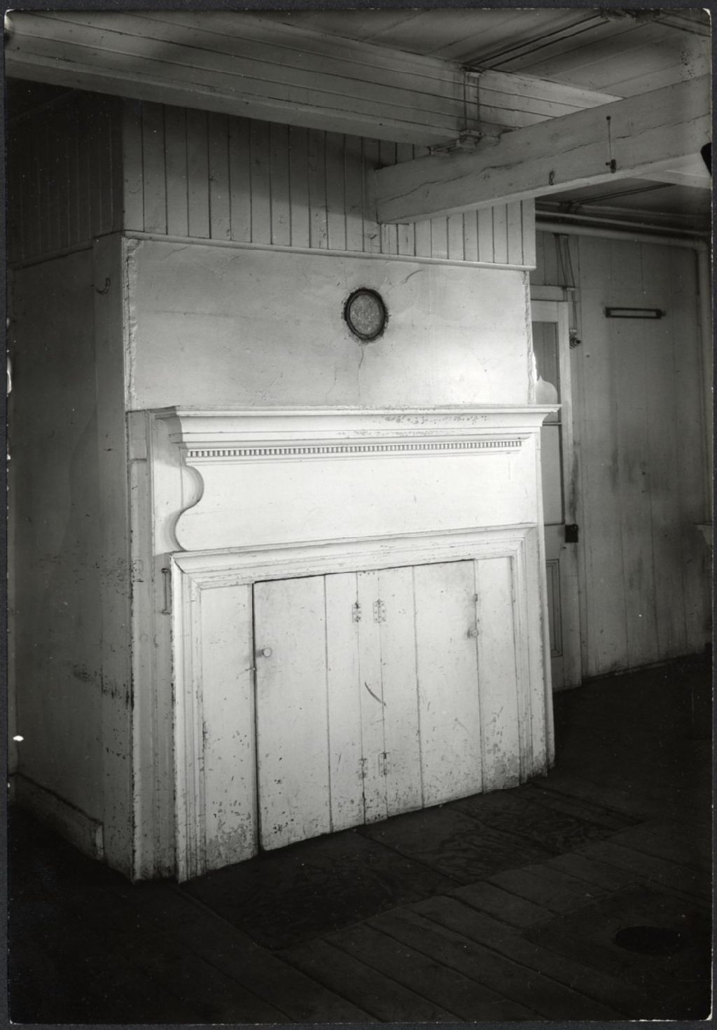 Photographie noir et blanc, Villa La Brocquerie, Boucherville, P.Q., vieille cheminée, cheminée blanche fermée, poutre