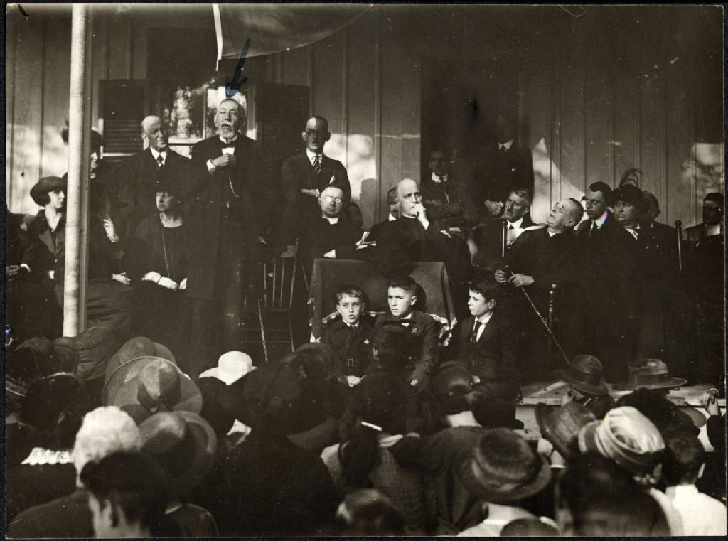 Photographie noir et blanc, A la villa la Broquerie, Boucherville, 1922, Passage d'Anatole de Boucherville au Canada (c'est lui qui parle), plusieurs hommes de dos dans l'assistance, trois garçons assis de face, un homme âgé s'adresse à la foule, une flèche dessiné à postériori l'identifie comme Anatole de Boucherville