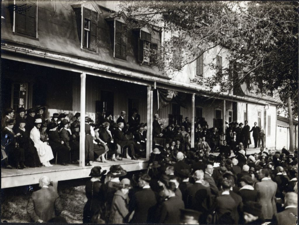 Photographie noir et blanc, a la villa La Brocquerie, Boucherville, 1922, passage d'Anatole de Boucherville, foule à l'avant d'une villa, personnes debout de dos, personnes assises sur la véranda de profil, on aperçoit Anatole de Boucherville debout sur la véranda qui s'adresse à la foule