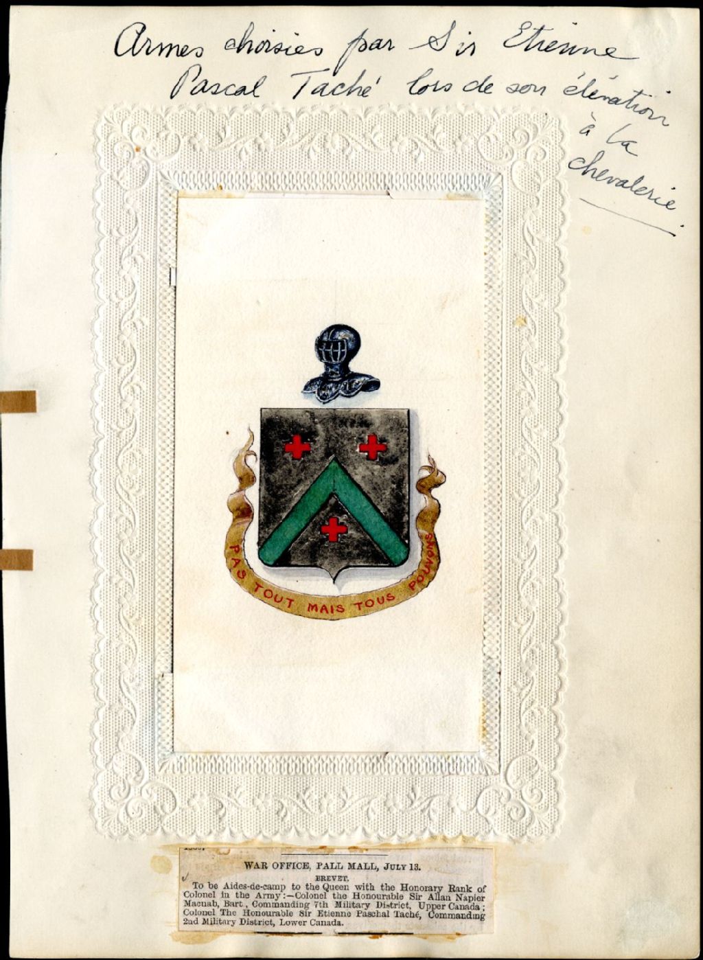 Armoiries couleur, "Pas tout mais tous pouvons", "Armes choisies par Sir Étienne Pascal Taché lors de son élévation à la chevalerie" "War office, pall mall, july 18, Brevet, To be Aides-de-camp, to the Queen with the Honorary Rank of Colonel in the Army:- Colonel the Honourable Sir Allan Napier Macnab, Bart, Commanding 7th Military District, Upper Canada; Colonel The Honourable Sir Etienne Paschal Taché, Commanding 2nd Military District, Lower Canada."