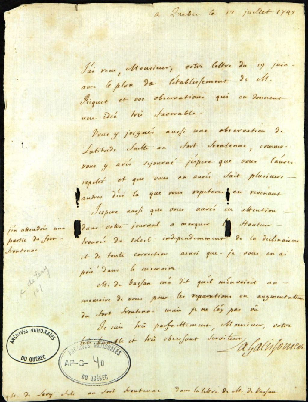 - Il a reçu sa lettre du 19 juin avec le plan de l'établissement de M. Picquet (Fort de la Présentation); une observation de latitude du Fort Frontenac est aussi jointe à la lettre; il espère aussi que Chaussegros de Léry indique la hauteur trouvée du soleil indépendemment de la déclinaison et de toute correction; il n'a pas reçu le mémoire pour les réparations ou l'augmentation du Fort Frontenac