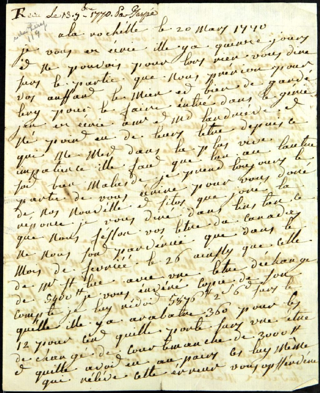 - Version intégrale légèrement normalisée : «À la Rochelle le 20 mai 1770. Je vous ai écrit il y a quinze jours et ne pouvais pour lors rien vous dire sur le parti que nous prenions pour vos enfant le mieux est bien de garder [François-Joseph Chaussegros de Léry] Lery pour le faire entrer dans le génie j'en ai écrit à monsieur et madame Landrieve et n'ai point eu de leurs lettres depuis ce qui me m'est dans la plus vive impatience il faut que l'un ou l'autre soit bien malade. Je prends toujours le parti de vous écrire pour vous donner de nos nouvelles et sitôt que j'aurai la réponse je vous dirai dans l'instant ce que nous faisons. Vos lettres du Canada ne nous sont parvenues que dans le mois de février le 26 ainsi que celle de monsieur St-Luc [Saint-Luc] avec une lettre de change de 5400 livres, je vous enverrai copie de son compte je lui redois 5876 livres 2 sols 6 deniers sur lequel il y a à rabattre 360 pour les 12 pour-cent qu'il [...]