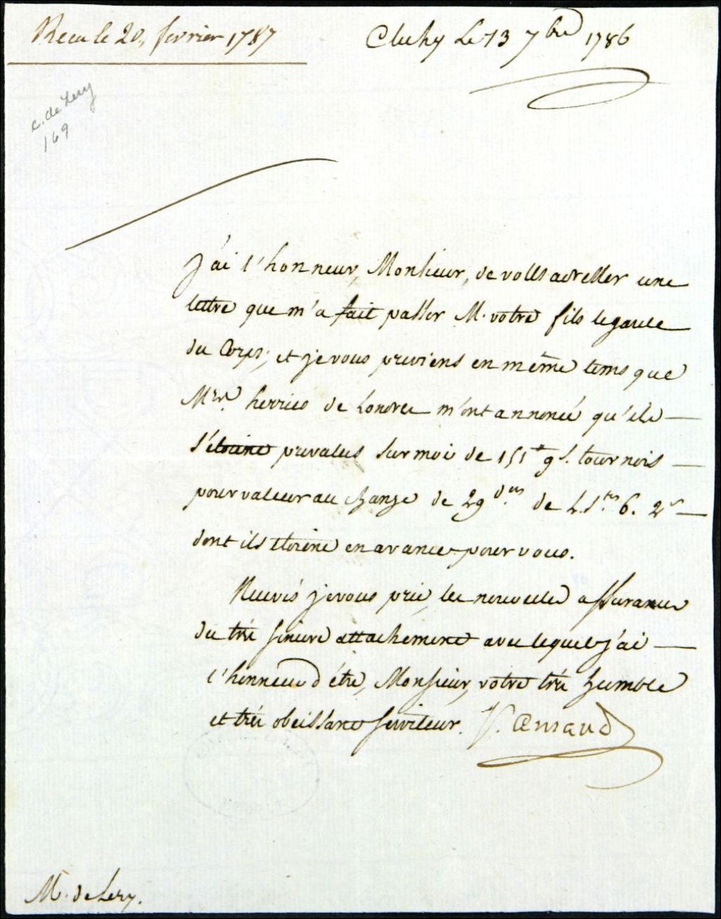 Lettre de M. Saint-Amand, fermier général, au sieur [Gaspard-Joseph] Chaussegros de Léry, 13 septembre 1786, Archives nationales à Québec, Fonds Famille Chaussegros de Léry, (03Q,P386,D169).