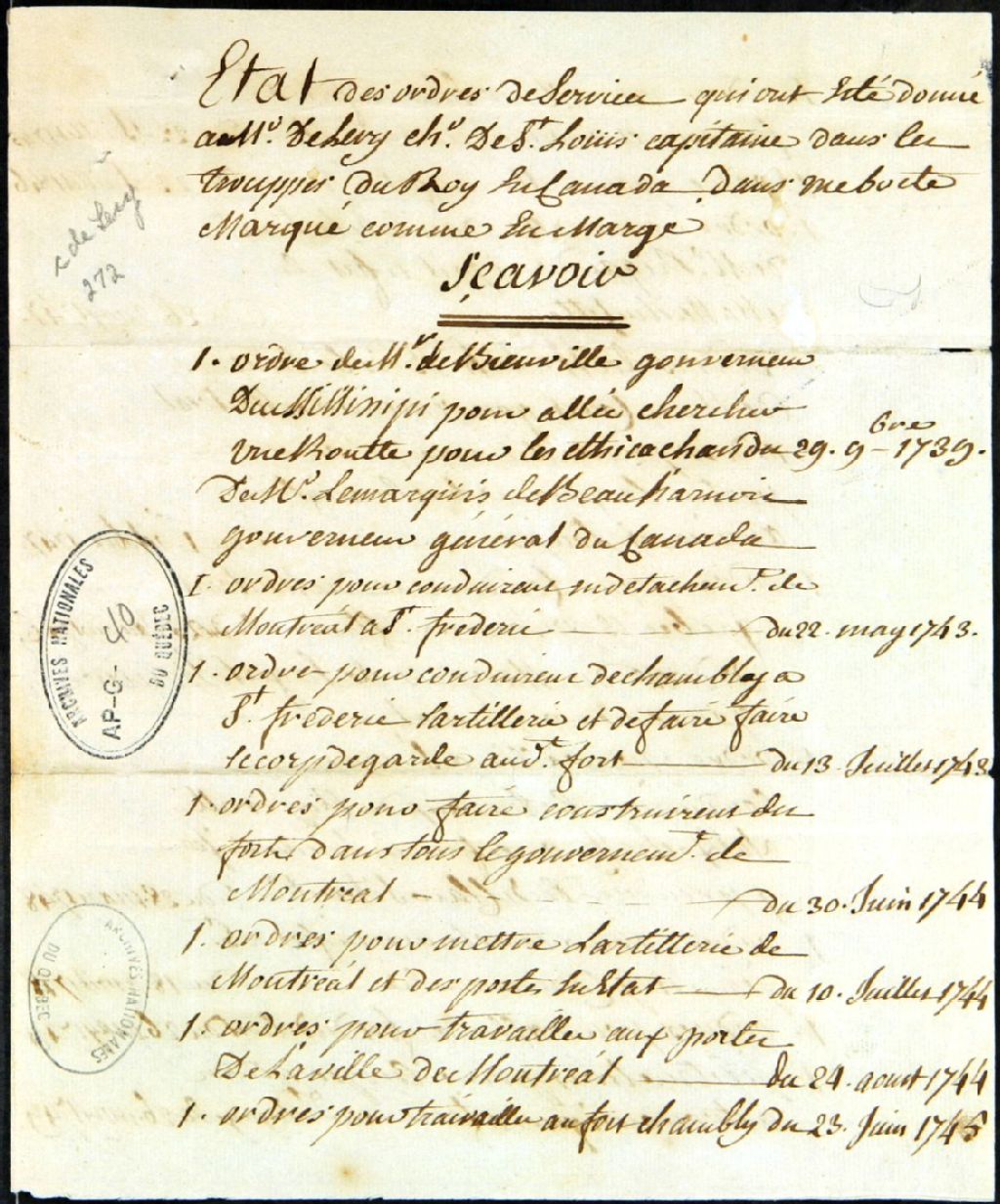 - État des ordres de services du sieur [Gaspard-Joseph] Chaussegros de Léry