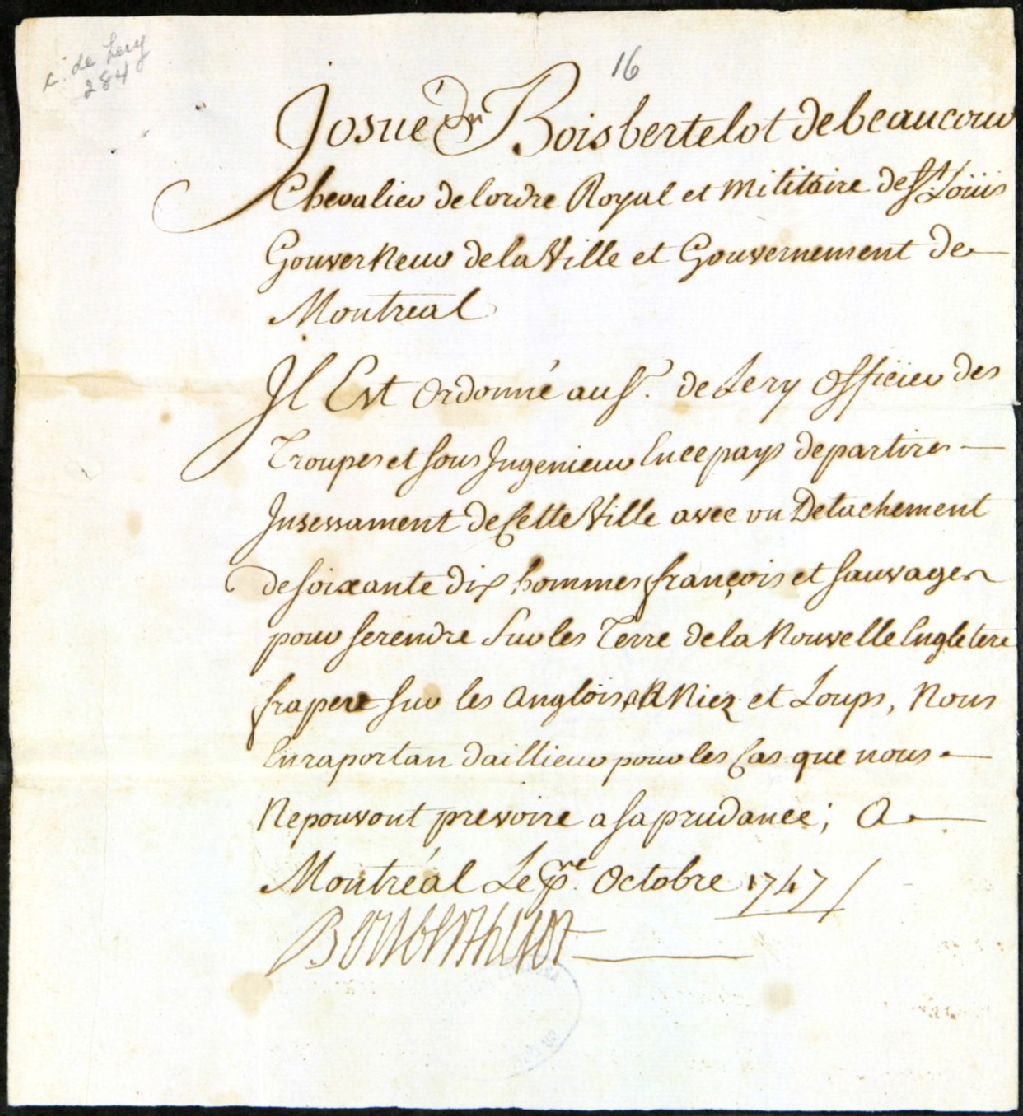 - Version intégrale légèrement normalisée : «Josué du BoisBerthelot de Beaucours, chevalier de l'ordre royal et militaire de St-Louis [Saint-Louis] gouverneur de la ville et gouvernement de Montréal. Il est ordonné au sieur de Lery, officier des troupes et sous ingénieur en ce pays, de partir incessamment de cette ville avec un détachement de soixante-dix hommes français et sauvages pour se rendre sur les terres de la Nouvelle Angleterre frapper sur les Anglais, Aniez [Agniers - Mohawks] et Loups, nous en rapportant d'ailleurs pour les cas que nous ne pouvons prévoir à sa prudence. À Montréal le premier octobre 1747. BOISBERTHELOT DE BEAUCOURS»