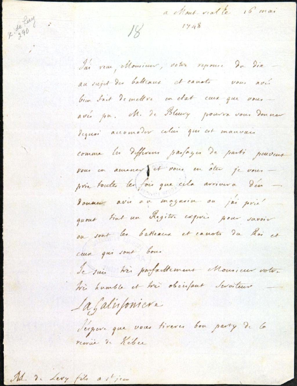 - Version intégrale légèrement normalisée : «À Montréal, le 16 mai 1748. J'ai reçu, monsieur, votre réponse du dix au sujet des bateaux et canots vous avez bien fait de mettre en état ceux que vous avez pu. M. de Bleury pourra vous donner de quoi accommoder celui qui est mauvais comme les différents passages de partis peuvent vous en amener et vous en ôter je vous prie toutes les fois que cela arrivera d'en donner avis au magasin où j'ai prié qu'on tînt un registre exprès pour savoir où sont les bateaux et canots du Roi et ceux qui sont bons Je suis très parfaitement monsieur votre très humble et très obéissant serviteur. LA GALISSONNIÈRE. J'espère que vous tirerez bon parti de la revue de Québec. M. de Lery fils à St-Jean [Saint-Jean]»