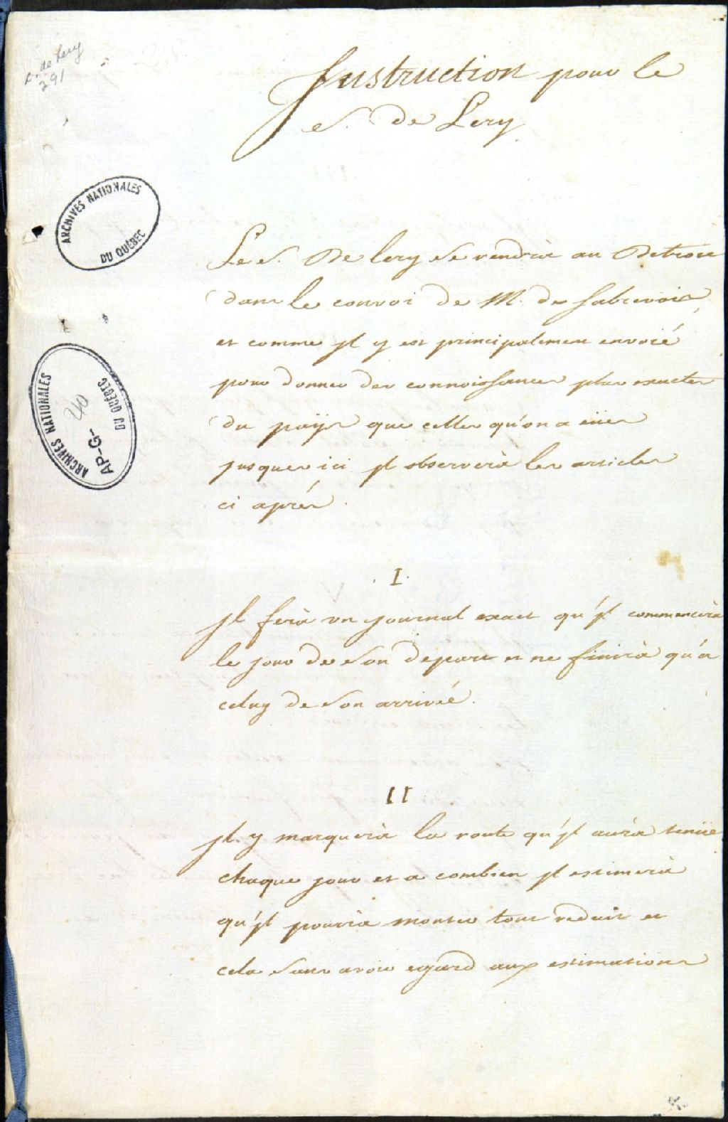 - Version intégrale légèrement normalisée : «Instruction pour le sieur de LeryLe sieur de Lery se rendra au Détroit dans le convoi de M. de Sabrevois, et comme il y est principalement envoyé pour donner des connaissances plus exactes du pays que celles qu'on a eues jusque ici il observera les articles ci-après. I. Il fera un journal exact qu'il commencera le jour de son départ et ne finira qu'à celui de son arrivée. II. Il y marquera la route qu'il aura tenue chaque jour et à combien il estimera qu'il pourra monter tout réduit et cela sans avoir égard aux estimations ordinaires des voyageurs dont cependant il fera mention. III. Il marquera aussi les recherches qu'il aura eu occasion de faire les jours de séjour et autres. IV. Tous les jours qu'il pourra prendre la hauteur du soleil à midi il la prendra et marquera sur son journal les raisons qu'il aura eues de s'en dispenser. V. Il prendra également hauteur tous les jours quand il séjournerait long temps dans le même endroitCes observations réitérées sont surtout nécessaires au fort Frontenac, au fond du lac Ontario, à Niagara, au portage de la longue pointe dans le lac Érié, à l'île aux Bois blancs et au Détroit. VI. Dans chaque endroit où le séjour sera un peu long il transcrira ce qu'il y aura de fait jusque là de son journal et adressera cette copie par le canal du commandant du poste au gouverneur ou commandant général. Cette précaution est pour que son travail ne fut pas perdu en cas de quelque accident qui arriverait à ses papiers dans la suite du voyage. Si après avoir fait cette copie il ne paraît point de canot avant lui il la laissera au commandant du lieu, ou bien il la mettra dans un canot différent du sien. VII. Le huit d'août il y aura une éclipse de lune. Si le sieur de Lery est alors dans un endroit où il y ait une bonne montre il réglera cette montre au soleil à midi dudit jour et observera à quelle heure aura commencé l'éclipse, ce qui sera environ à cinq heures et demie du soir, il observera aussi à quelle heure elle aura fini ce qui sera vers les huit heures trois quarts et il le marquera sur son journal, il y marquera aussi de combien la montre aura avancé ou retardé depuis ce midi jusqu'à celui du lendemain quand ce ne serait que d'une minute. VIII. Dans tous les endroits où le sieur de Lery passera il fera mention sur son journal de la qualité des terres, des espèces et qualités de bois qui y viennent, des rivières et montagnes voisines et de quel côté elles s'étendent. IX. Dès en montant la rivière dite de Katarakoui il observera différentes chutes et remarques si on ne pourrait point rendre la navigation plus sûre ou plus aisée par quelques dépenses on fera en même temps l'estimation à peu près. X. Dans le lac Ontario il fera mention dans son journal des endroits qui lui paraîtront propres à servir de havres aux barques. XIIl. redoublera d'attention sur cet article dans le lac Érié où les havres sont beaucoup plus rares. XII. Pendant son séjour au Détroit il visitera la rivière au-dessus et au-dessous du fort et examinera si dans les basses eaux les barques pourraient facilement passer du lac Érié dans le lac huron et le chenal qu'elles devraient faire. XIII. Pour satisfaire aux articles ci-dessus il est nécessaire qu'il ait dans son canot un ou deux compas de route et un plomb de sonde de deux ou trois livres avec du suif et environ trente à quarante brasses de ligne du banc. XIV. Dans tout le cours du voyage en allant et en venant il observera principalement les cantons propres à former des établissements ou à construire des forts et indiquera le plus clairement qu'il pourra dans son journal les lieux où il faudrait placer les forts ou les habitations. XV. S'il passe à la mission de M. Picquet [François Picquet], il en examinera la situation les incommodités et commodités etc. XVI. S'il passe à Niagara il examinera la situation présente du lac et la place la plus convenable où on pourrait rebâtir le fort si le lac continuait à gagner de ce côté là. Il examinera aussi les réparations urgentes qu'on y peut faire. XVII. Mais ce que je lui recommande le plus d'observer c'est s'il ne serait point utile de bâtir un fort plus considérable au haut des côtes et de laisser un simple corps de garde avec un magasin de traite dans l'endroit où est le fort d'aujourd'hui. XVIII. Il fera en même temps à peu près l'estimation de la dépense qu'il conviendrait faire pour rendre le portage plus aisé et plus sûr. XIX. Il ne s'étendra point dans son journal sur les rencontres des Sauvages [Amérindiens] ou autres aventures qui regardent le commandant du convoi. XX. S'il se rencontrait sur son chemin quelques pierres ou terres où il y eut apparence de mines il en fera mention dans son journal et en apportera, s'il peut, des échantillons et indiquera bien clairement et bien exactement l'endroit d'où elles auront été tirées. XXI. Si chemin faisant il peut ramasser quelques'unes des graines plantes etc. mentionnées dans le mémoire qui lui sera remis avec ceci, il les apportera, mais cela ne doit point le détourner des objets plus intéressant pour le service. Fait à Mont-Réal le 26 mai 1749. LA GALISSONIÈRE»