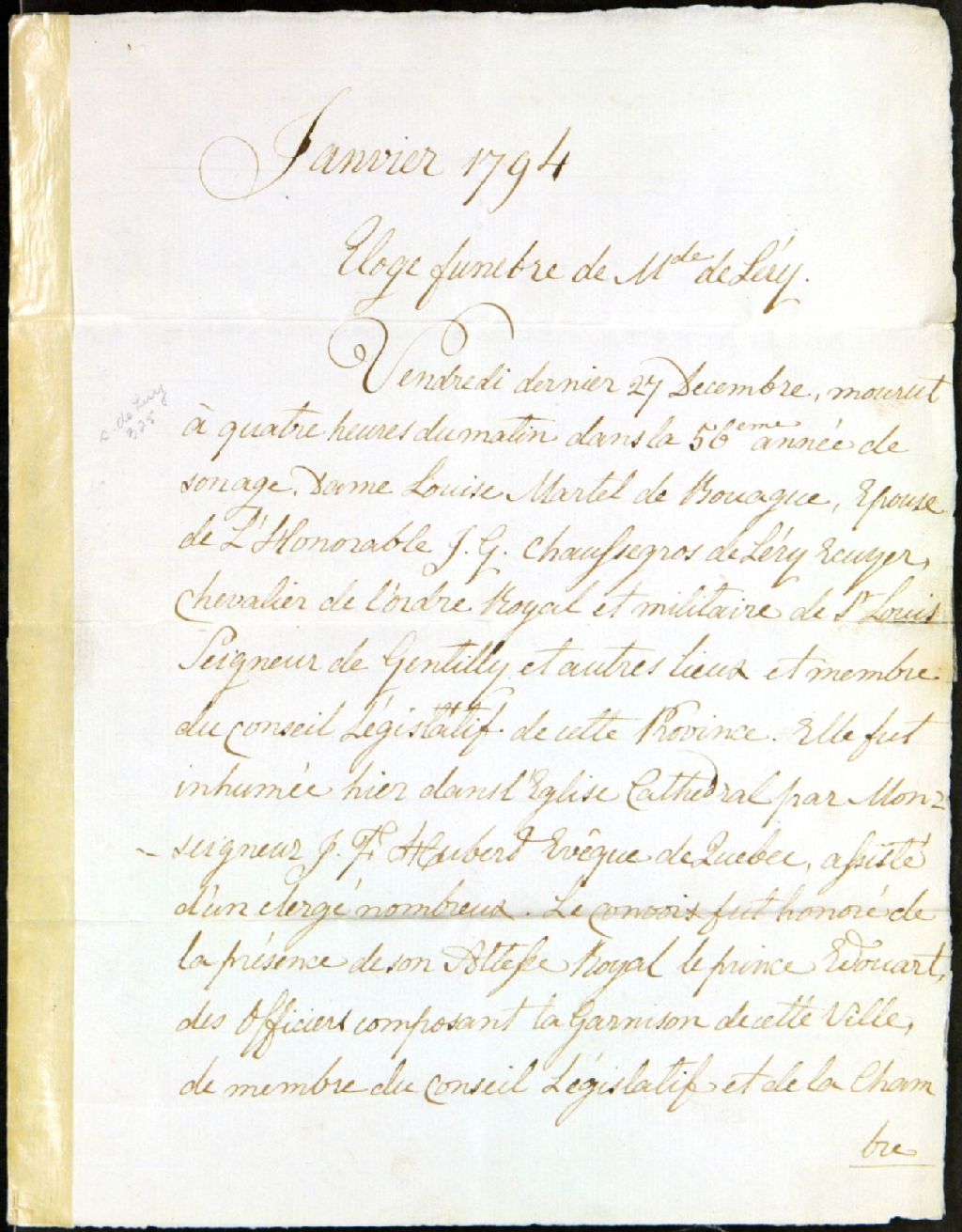 - Éloge funèbre de Louise Martel de Brouage, épouse de Gaspard-Joseph Chaussegros de Léry