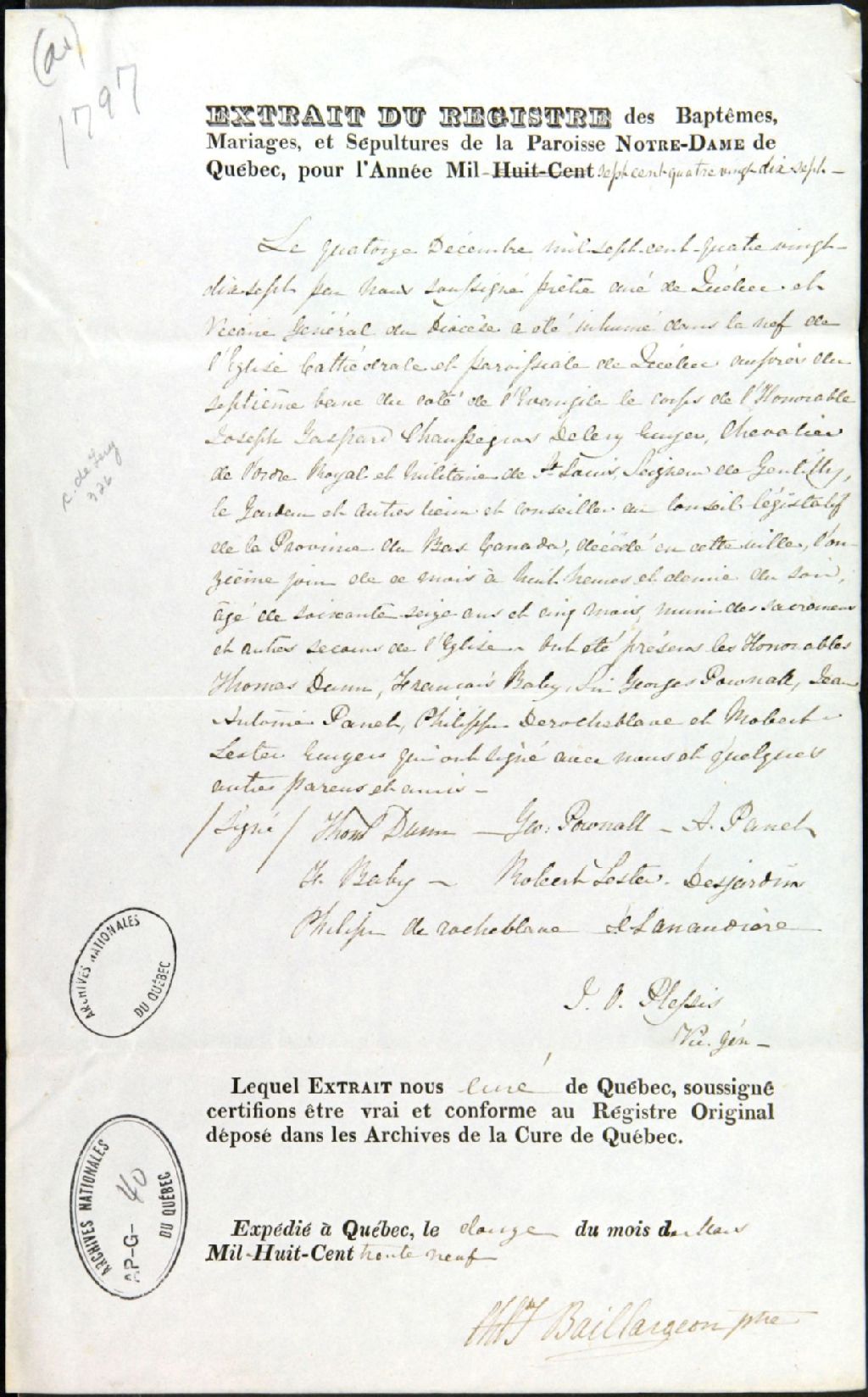 Acte de décès de Gaspard-Joseph Chaussegros de Léry - le prêtre Baillargeon authentifie l'acte, 14 décembre 1797, Archives nationales à Québec, Fonds Famille Chaussegros de Léry, (03Q,P386,D326).