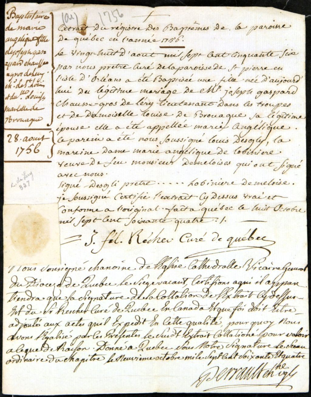 Extrait de baptême de Marie-Angélique de Léry - un curé de Québec et le vicaire général du diocèse de Québec authentifient l'acte, 22 août 1756, Archives nationales à Québec, Fonds Famille Chaussegros de Léry, (03Q,P386,D327).