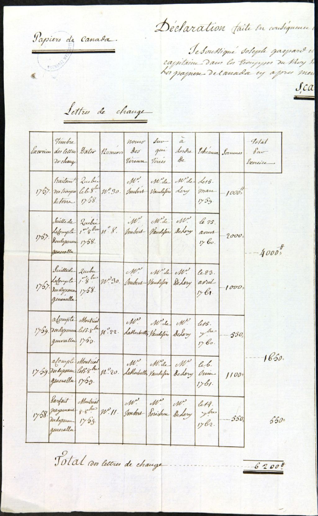 Déclaration des lettres de change et des billets de monnaie ou ordonnances de Gaspard-Joseph Chaussegros de Léry faite en conséquence de l'arrêt du Conseil du 24 décembre 1762