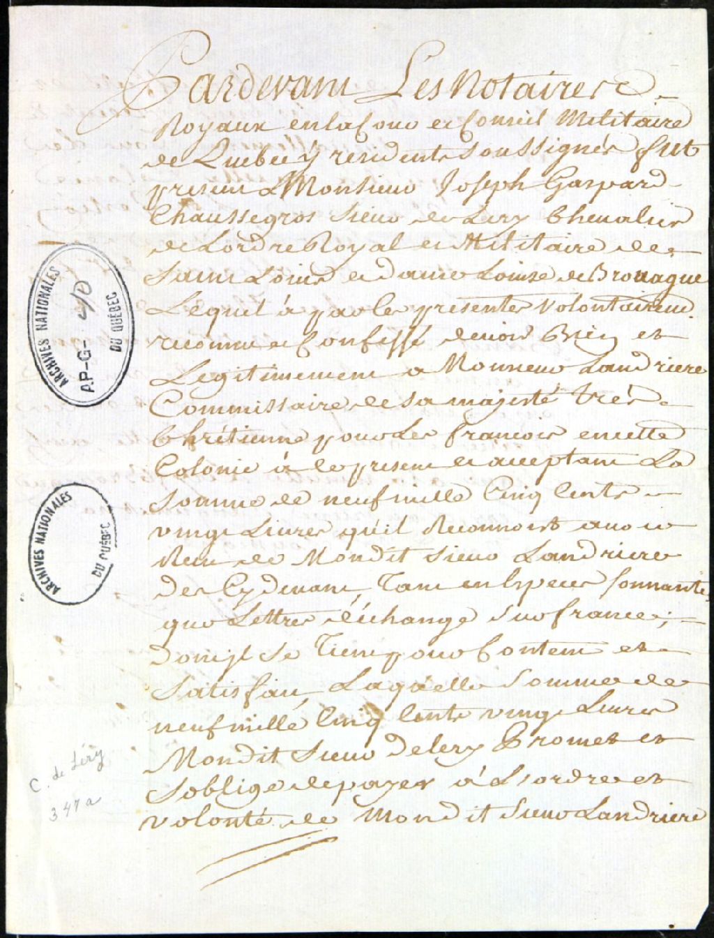 Quittance de 9520 livres donnée au sieur Gaspard-Joseph Chaussegros de Léry par monsieur Landriève, 3 octobre 1764, Archives nationales à Québec, Fonds Famille Chaussegros de Léry, (03Q,P386,D347-A).