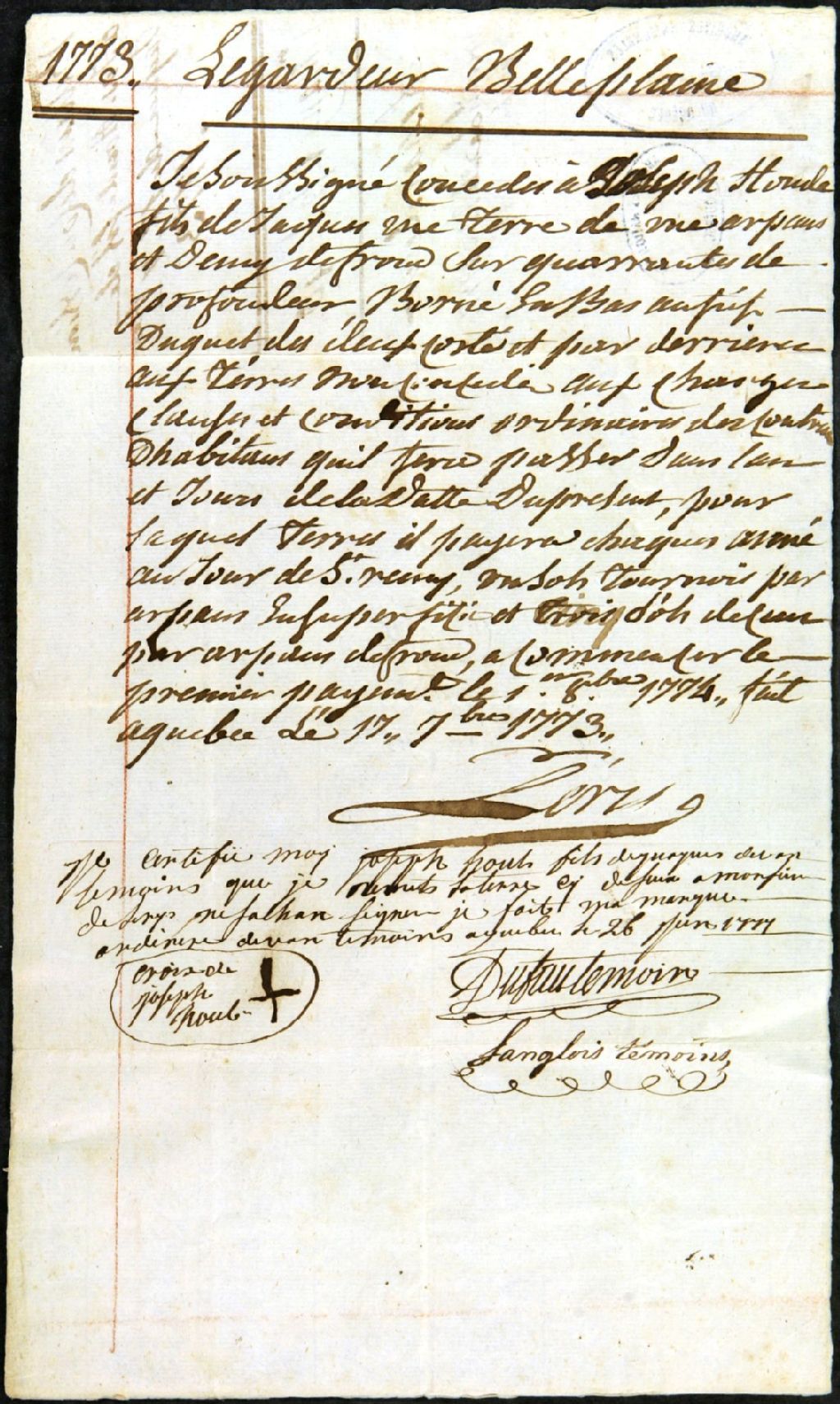 Billet de concession donné par Gaspard-Joseph Chaussegros de Léry, seigneur de Legardeur de Belleplaine, à Joseph Houde; une remise de concession au seigneur est aussi présente en date du 26 juin 1777