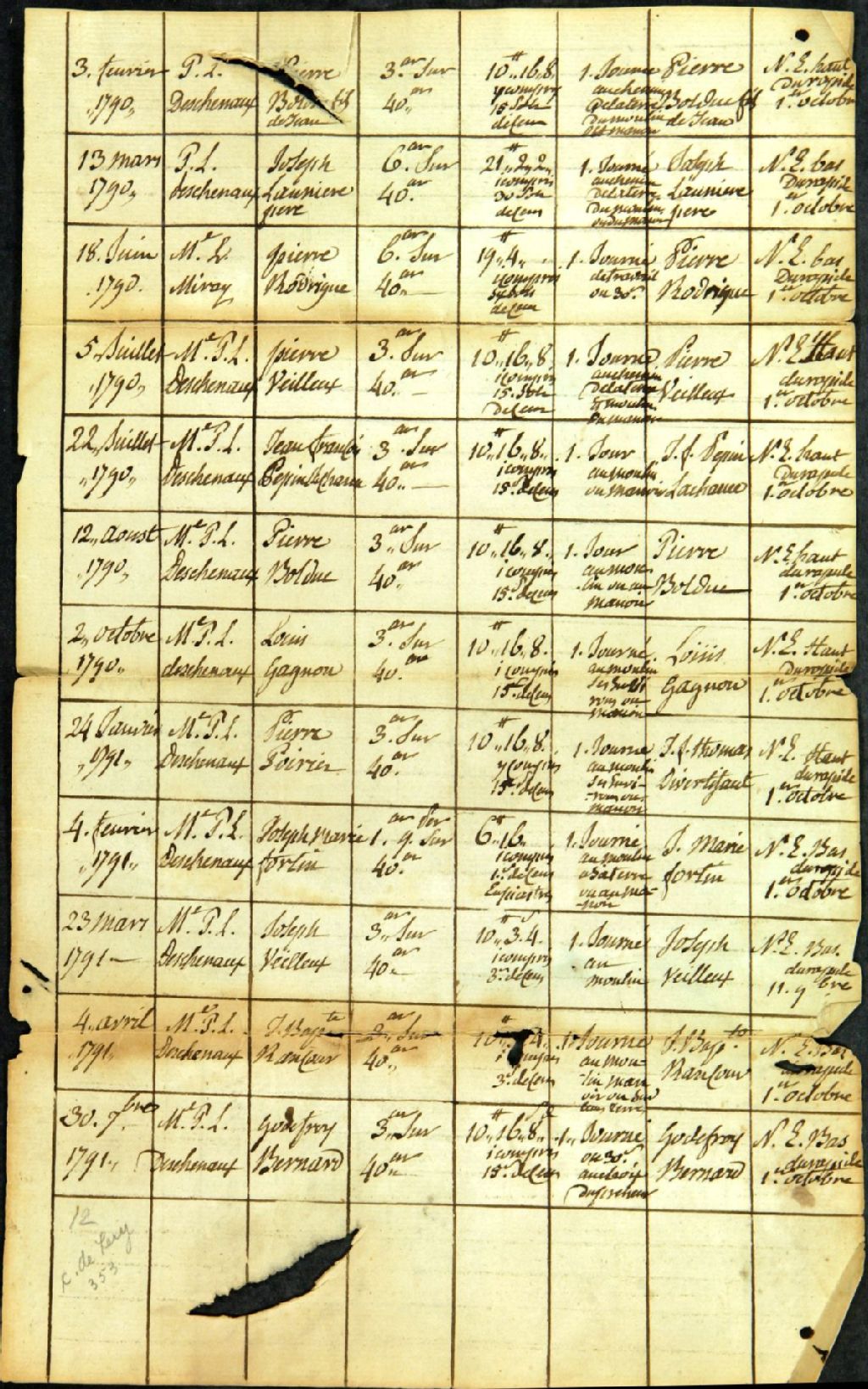 Rolle des contrats de concession donnés par Gaspard-Joseph Chaussegros de Léry, Entre le 15 décembre 1773 et le 30 septembre 1791, Archives nationales à Québec, Fonds Famille Chaussegros de Léry, (03Q,P386,D353).