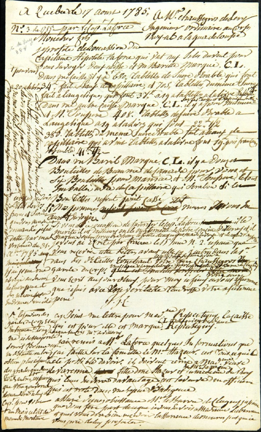 - Il écrit à son fils qu'il lui a envoyé du sucre d'érable dans un baril marqué C. L.; il demande à son fils de favoriser le capitaine Laforce; il joint une lettre pour madame de Repentigny; il demande à son fils de lui envoyer du vin de champagne; il indique à son fils qu'il a reçu le ruban de Saint-Louis que lui a envoyé M. Saint-Amand