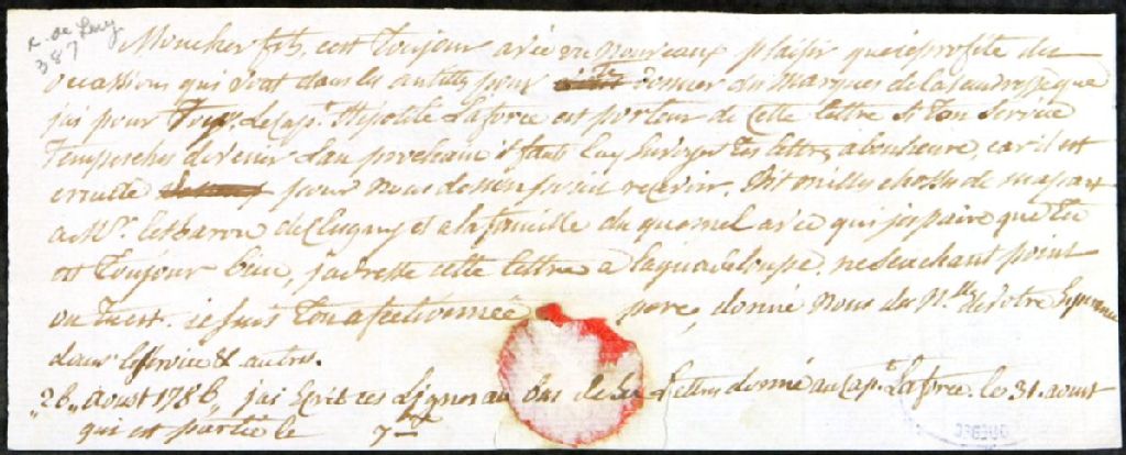 - Il donne des indications à son fils pour la poursuite de leur correspondance via le capitaine Laforce; il mentionne à son fils de dire mille choses gracieuses de sa part à la famille du Baron de Clugny et à celle de demoiselle Duquenel