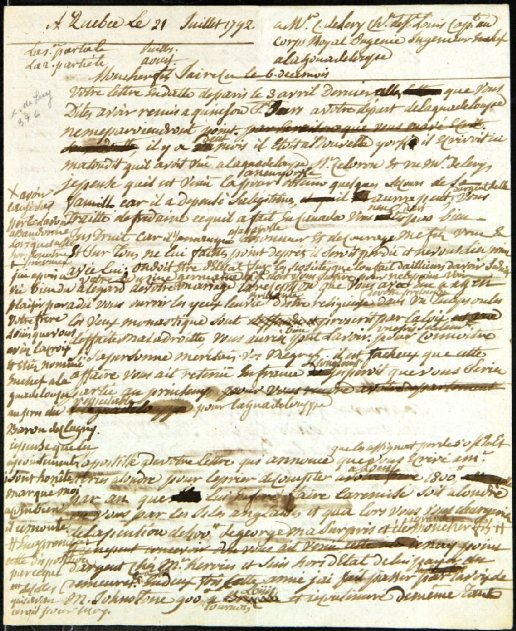 - Il donne des nouvelles de M. Celoron et il lui dit de ne pas se lier à lui; il lui écrit à propos d'une cousine; il lui écrit également à propos d'un mariage et de ses affaires en France; il demande à son fils d'écrire à Londres pour des affaires de nature économique; il écrit à propos d'un projet à la Guadeloupe et des conditions pour l'approuver; il donne des nouvelles de ses frères et soeurs; il demande des nouvelles de son cousin Chaussegros, capitaine à Toulon; il informe son fils qu'il a été congédié du Conseil et de la Cour d'appel ce qui lui a fait perdre 100 louis par année et «que je suis le second du conseil legislatif que lon appel Chambre Haute qui me donne [...] appointement»