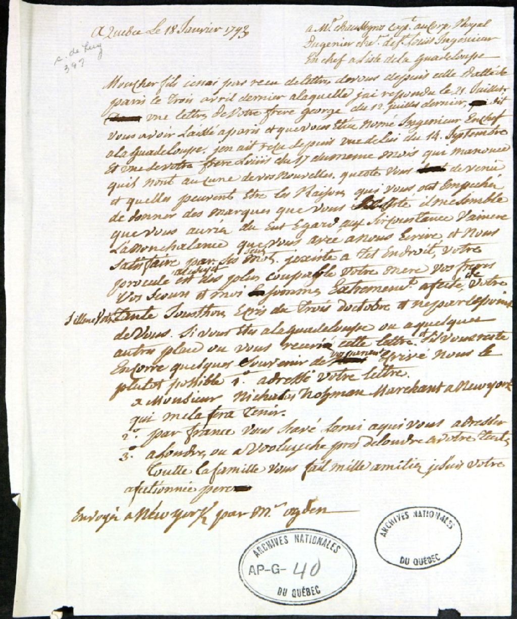 Brouillon d'une lettre de Gaspard-Joseph Chaussegros de Léry à son fils François-Joseph Chaussegros de Léry, ingénieur à la Guadeloupe, 18 janvier 1793, Archives nationales à Québec, Fonds Famille Chaussegros de Léry, (03Q,P386,D397).