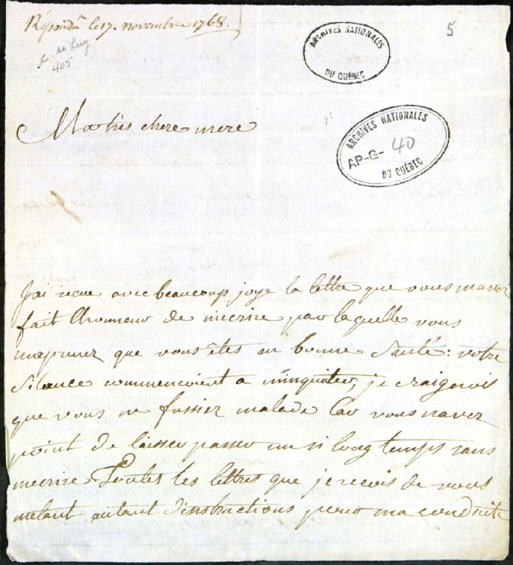 - Il a reçu sa lettre dans laquelle elle mentionne qu'elle est en bonne santé; il informe sa mère qu'il a une bonne conduite et une bonne éducation; il demande à sa mère de saluer son oncle Degly [Deglis]