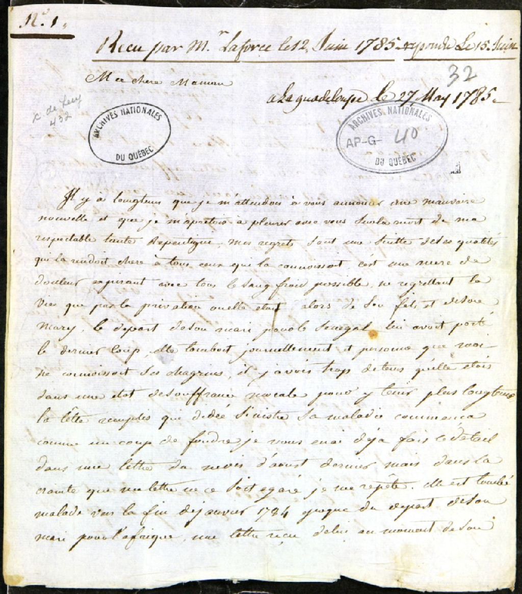 - Il annonce la mort de sa tante de Repentigny; il écrit sur le fait qu'il ne s'est pas marié et qu'il est resté garçon; il veut travailler pour sa famille; il est heureux du mariage de sa soeur; il a reçu des nouvelles de ses frères et soeurs et leur répondra bientôt; il demande des nouvelles de son oncle Deglis, de sa tante Sainte-Marie, de sa tante Lotbinière et de son fils; il demande de leur dire que Lotbinière s'est fait reconnaître marquis; il n'a plus de nouvelles de son frère qui est en France; il écrit à propos d'une guerre possible entre l'empereur et les Néerlandais qui entretient la crainte qu'elle soit générale; il écrit à propos de M. de Céloron; il transmet les salutations de M Duquesnel et donne des nouvelles à son sujet; il embrasse sa mère et salue ses frères et soeurs; il donne des nouvelles d'un jeune homme nommé Desauniers, passé en Martinique en 1775; il donne des nouvelles de son cousin Repentigny qui doit arriver sous peu en Martinique en provenance de Cayenne; il envoie trois barils de confiture à sa mère de la part de la femme de son cousin Repentigny soit un au gingembre, un au citron, un de papaye et écorce et l'autre de lime; il joint également une caisse de liqueur de la Martinique et un baril de café; il a reçu le sucre d'érable, de beaume du Canada, le capilaire et les prunes à l'eau-de-vie que ses parents lui ont envoyés; il donne de ses nouvelles à sa mère
