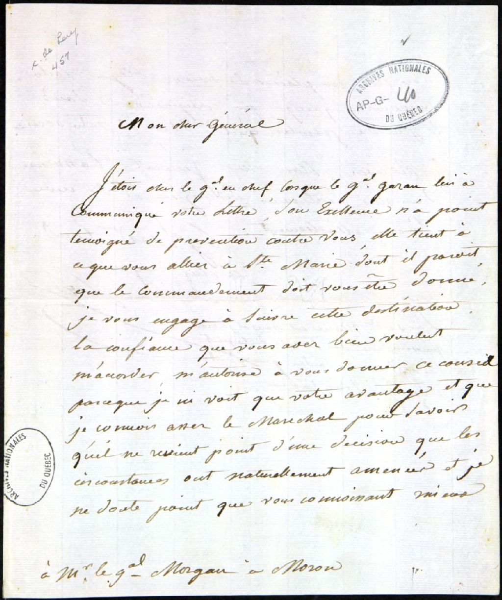 - Lettre de François-Joseph Chaussegros de Léry, commandant en chef du génie, au général Morgan
