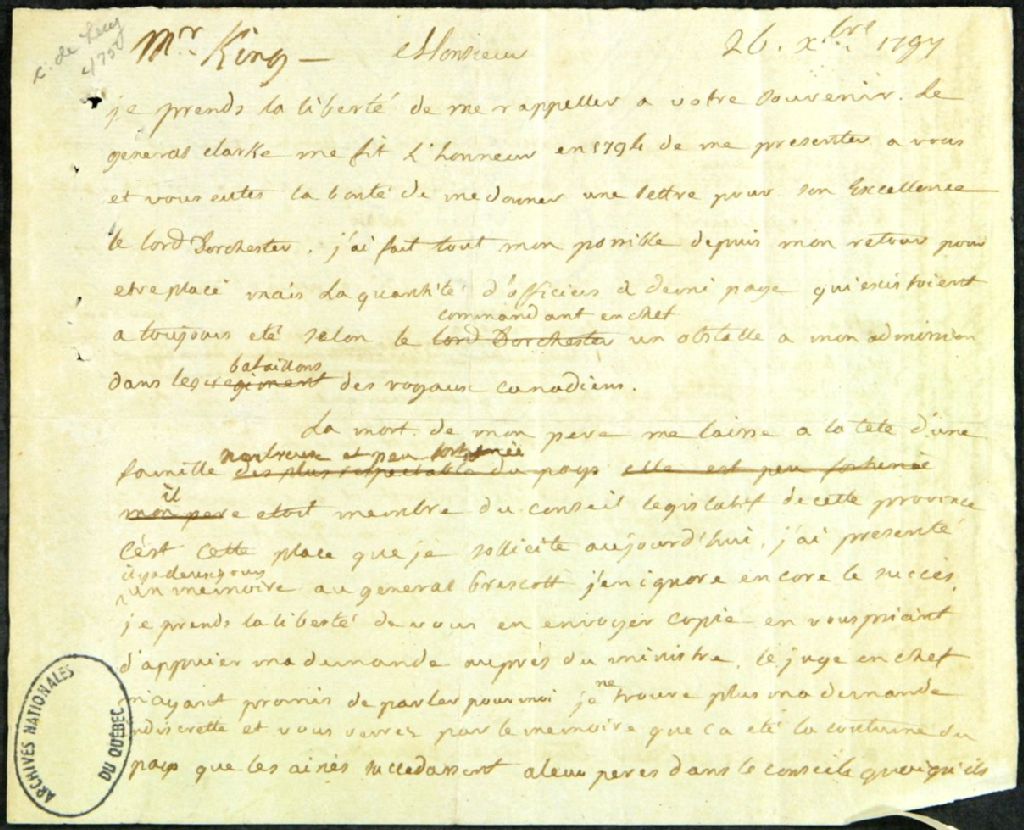 Version intégrale légèrement normalisée : «26 décembre 1797 Monsieur King ¿Monsieur Je prends la liberté de me rappeler à votre souvenir. Le général Clarke me fit l'honneur en 1794 de me présenter à vous et vous eûtes la bonté de me donner une lettre pour son excellence le lord Dorchester, j'ai fait tout mon possible depuis mon retour pour être placé mais la quantité d'officiers à demi paye qui existaient a toujours été selon le commandant en chef un obstacle à mon admission dans les bataillons des royaux canadiens. La mort de mon père me laisse à la tête d'une famille nombreuse et peu fortunée il était membre du Conseil législatif de cette province c'est cette place que je sollicite aujourd'hui, j'ai présenté il y a deux jours un mémoire au général Prescott j'en ignore encore le succès, je prends la liberté de vous en envoyer copie en vous priant d'appuyer ma demande auprès du ministre, le juge en chef m'ayant promis de parler pour moi je ne trouve plus ma demande indiscrète et vous verrez par le mémoire que ça été la coutume du pays que les aînés succédassent à leur père dans le conseil quoiqu'ils aient un prince étranger depuis la conquête. Mon père jouissait aussi d'une pension de 1200. Elle se trouve éteinte par sa mort. Si je puis obtenir par votre entremise, sa place au Conseil ce sera un pas pour avoir par la suite un emploi plus lucratif et soutenir par les bienfaits de Sa Majesté une famille des plus attachées à son gouvernement et une des meilleurs du pays qu'il est de l'intérêt et de la générosité du roi de ne pas laisser tomber en Canada. Serait-ce être indiscret de vous prier de me recommander au général Prescott son excellence m'avait promis l'année dernière qu'elle ne m'oublierait pas dans l'occasion un mot de votre part le lui rappelerait. Excusez la démarche que je fais aujourd'hui elle est fondée sur la connaissance que des personnes telle que le général Clarke et bien d'autres m'ont donné de votre caractère généreux et bienfaisant.»