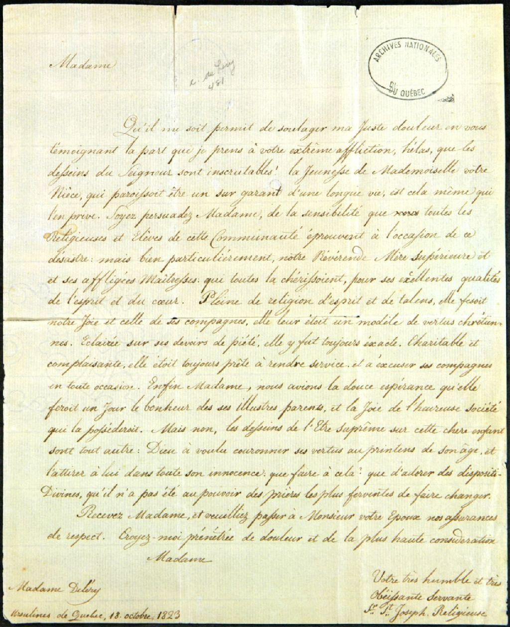 Lettre de soeur Saint-Joseph, religieuse au monastère des Ursulines de Québec, à madame Louis-René Chaussegros de Léry, 18 octobre 1823, Archives nationales à Québec, Fonds Famille Chaussegros de Léry, (03Q,P386,D481).