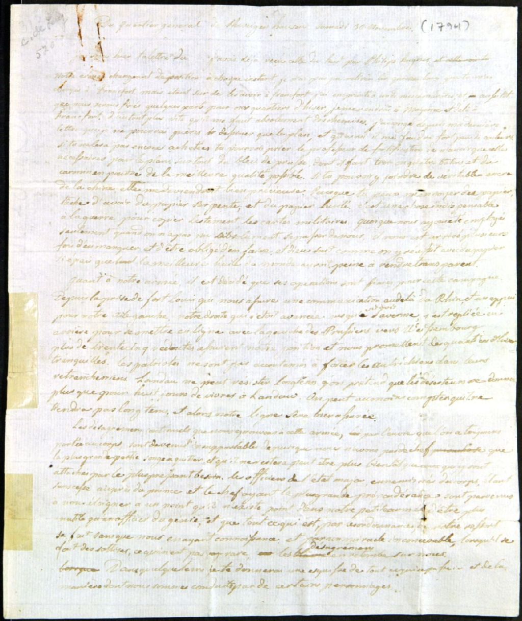 - Version intégrale légèrement normalisée : «Du quartier général de Shweiger Hausen Samedi 30 novembre. J'ai reçu hier ta lettre du (¿) J'avais déjà reçu celle du huit par Philippe Hugues. Notre armée changeant de position à chaque instant, je n'ai pas pu retirer les quinze louis que tu m'as envoyés à Francfort, mais étant sur de les avoir à Francfort j'ai emprunté à un de mes camarades; et aussitôt que nous serons fixés quelques parts pour nos quartiers d'hiver, je me rendrai à Mayence et delà à Francfort. D'autant plus vite qu'il me faut absolument des chemises. J'ai songé depuis ma dernière lettre que je ne pourrai guère dessiner que le plan, et qu'ainsi il me faudra fort peu de couleurs. Si tu ne les a pas encore achetées tu pourrais prier le professeur de fortification de n'avoir que celles nécessaires pour le plan surtout du bleu de Prusse, dont il faut trois ou quatre bâtons, et du carmin en poudre de la meilleure qualité possible. Si tu pouvais y joindre du véritable encre de la Chine elle me deviendrait bien précieuse. Puisque tu peux m'envoyer des papiers, tâche d'avoir du papier serpente; et du papier huilé; c'est une chose indispensable à la guerre pour copier lestement les cartes militaires quoique nous ayons été employés seulement quand on n'a pas pu absolument se passer de nous, il nous est arrivé plusieurs fois d'en manquer et d'être obligé d'en faire, et dieu sait comme on y réussit avec du papier si épais que la meilleure huile du monde aurait peine à rendre transparent. Quant à notre armée, il est décidé que ses opérations sont finies pour cette campagne. Depuis la prise du fort Louis qui nous assure une communication au-delà du Rhin, et un appui pour notre aile gauche, notre droite qui s'était avancée jusque vis-à-vis Saverne s'est repliée en arrière pour se mettre en ligne avec la gauche des Prussiens vers Weissembourg plus de trente-cinq redoutes assurent notre position et nous promettent des quartiers d'hiver tranquilles. Les patriotes ne sont pas accoutumés à forcer les Autrichiens dans leurs retranchements. Landau ne peut résister longtemps. On prétend que les déserteurs ne donnent plus que pour huit jours de vivres à Landau. On peut au moins compter qu'il ne tiendra pas longtemps, et alors notre ligne sera bien assurée. Les désagréments continuels que nous éprouvons à cette armée, par l'envie que l'on à toujours portée au corps, sont devenus si insupportables depuis que nous n'avons pas de chef que la plus grande partie songe à quitter, et qu'il ne restera peut-être plus bientôt que ceux qui y sont attachés par le plus pressant besoin. Les officiers de l'état-major, ennemis jurés du corps, étant sans cesse auprès du prince et le chef ayant la plus grande prépondérance sont parvenus à nous éloigner à un point qu'il n'existe point dans notre petite armée d'être plus inutile qu'un officier du génie, et que tout ce qui est, par les ordonnances, de notre ressort se fait sans que nous ayons connaissance et par un miracle inconcevable, lorsqu'il se fait des sottises ce qui n'est pas rare, les désagréments en retombent sur nous. Dans quelque temps je te donnerai une esquisse de tout ce qui se passe et de la manière dont nous sommes conduits par de certains personnages. Comme il est trop désagréable de rester ainsi, repoussé sans cesse d'auprès du prince, et en but à la mauvaise volonté de certains chefs, de l'armée surtout lorsque tous ceux du corps qui sont dans le cas, par leur âge leur grade surtout leur langue de lutter contre eux et de faire valoir nos droits seront partis, je voudrais que tu t'informes s'il ne serait pas possible de passer à Toulon et d'y être admis à servir. On n'y reçoit pas les émigrés indistinctement, il faut être connu des chefs, anglais ou français, tu pourrais écrire à monsieur de Chaussegros, en l'assurant bien que je n'ai aucun besoin de secours pécuniaires. D'ailleurs si mon oncle voulait encore s'employer pour moi, il pourrait écrire au colonel du Génie qui est allé avec Philips, ou à toute autres personnes de marque qui sont à Toulon, qu'il pourrait connaître, il y a plusieurs officiers du corps qui songent à y aller, s'il réussissent à se faire recevoir comme je suis extrêmement bien avec eux, ils m'ont promis qu'il serait question de moi dans leur mémoire. Ce serait un grand avantage à tous égards parce que l'on y aurait des appointements suffisant, et que l'on y serait employés au lieu qu'ici on ne trouve ni l'un ni l'autre marque moi de suite ce que tu penses de cette idée, et alors j'écrirais aussi à monsieur de Chaussegros et je ferais de mon côté tout ce que je croirais de plus propre à réussir. Tu auras sans doute joints au paquet que tu dois renvoyer les livres anglais que je t'ai demandés quelque soit l'événement il sera absolument nécessaire pour moi de savoir l'anglais, soit que je retourne en Canada, soit que j'aille à Toulon, car je ne crois pas qu'il soit possible pour nous de faire une autre campagne, dans cette armée les choses sont telles que nous n'y pouvons plus rester à moins que le prince ne fasse une réforme convenable dans son état-major et la chose n'est pas probable. Nous avons été tous ces jours-ci en alerte continuelle les patriotes conduits par les paysans sont venus nous attaquer successivement sur tous les points apparemment pour reconnaître notre position. Ils se sont faits rosser plusieurs fois de main de maître. C'est probablement ce qui a ralenti leur pétulance le 19 en voyant replier notre aile droite, ils ont cru que malgré la bataille que nous avions remporté sur eux la veille, du côté de Brumat, et les avantages que le général de Hatze avait eus sur eux pendant la nuit même, nous songions à faire retraite et se sont imaginés nous faire presser le pas en nous harcelant sans cesse; mais ils se sont enfin persuadés que cette espèce de retraite éta