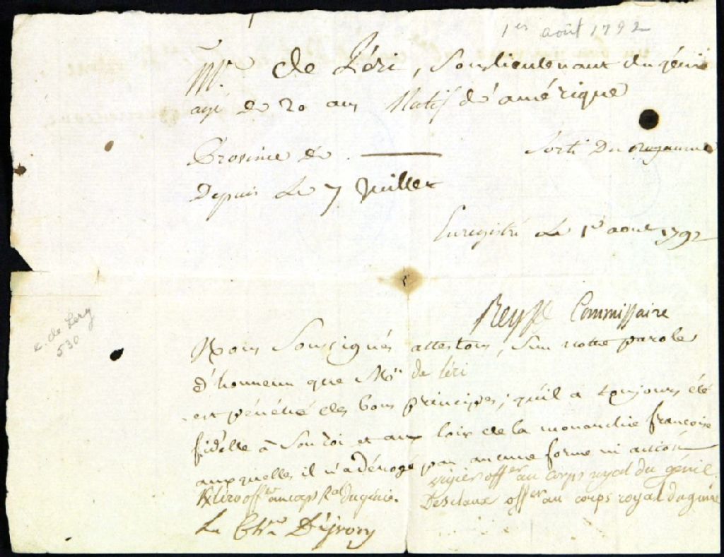 Certificat de fidélité à la monarchie française de Gaspard-Roch-George Chaussegros de Léry, 1er août 1792, Archives nationales à Québec, Fonds Famille Chaussegros de Léry, (03Q,P386,D530).