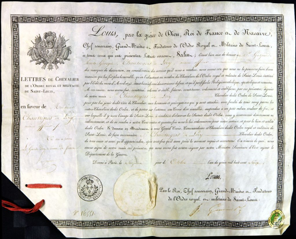 Lettre de Chevalier de l'Ordre royal de Saint-Louis en faveur de Gaspard-Roch-George Chaussegros de Léry, 16 octobre 1816, Archives nationales à Québec, Fonds Famille Chaussegros de Léry, (03Q,P386,D537).